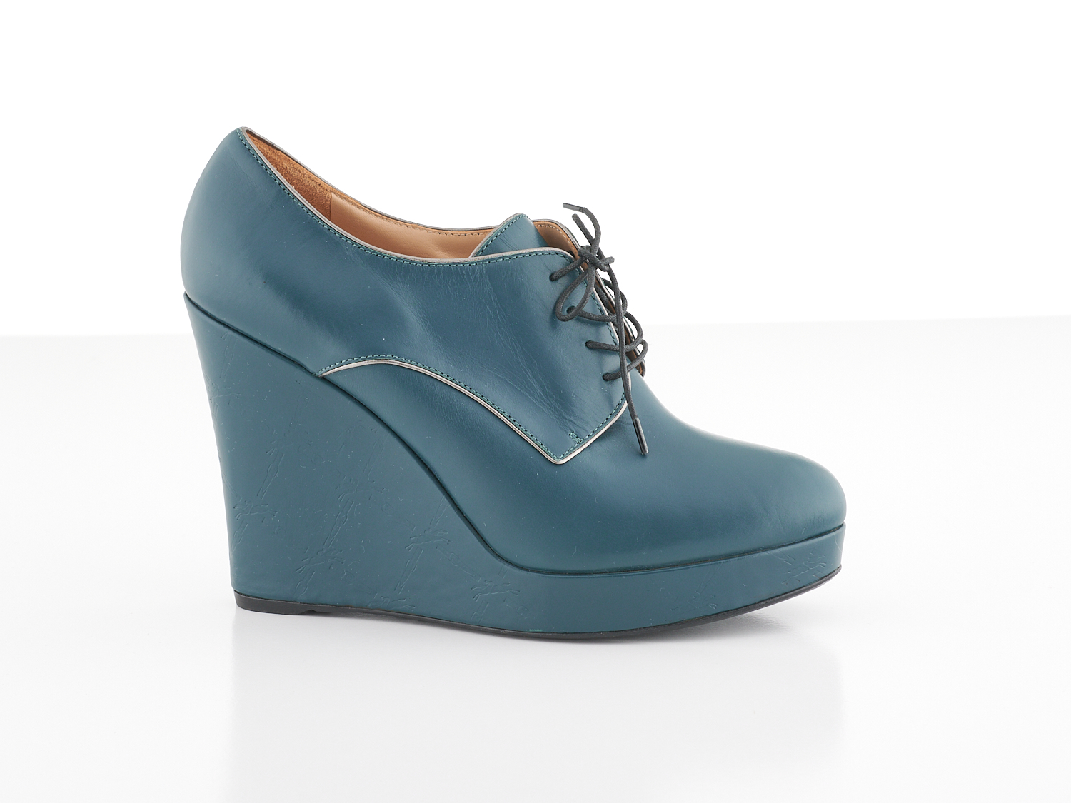 LONGCHAMP, PLATFORM WEDGES - Styled in teal leather with lace-up gusset, embossed logo leather on wedge, marked size 40.