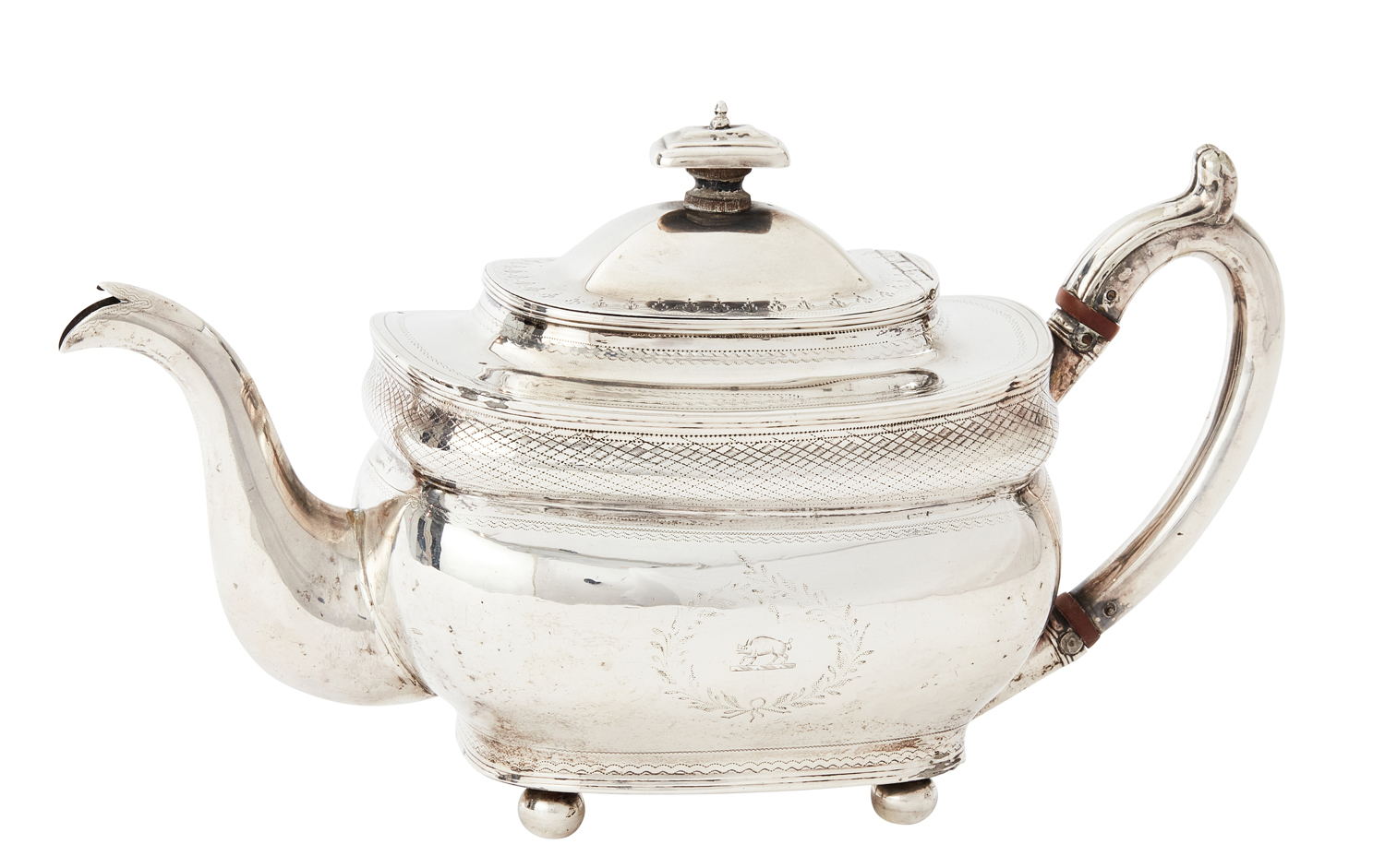 Maker's mark of Robert Breading, Dublin 1807, of rounded rectangular outline with domed cover, scroll capped handle and ball feet, having engraved decoration.