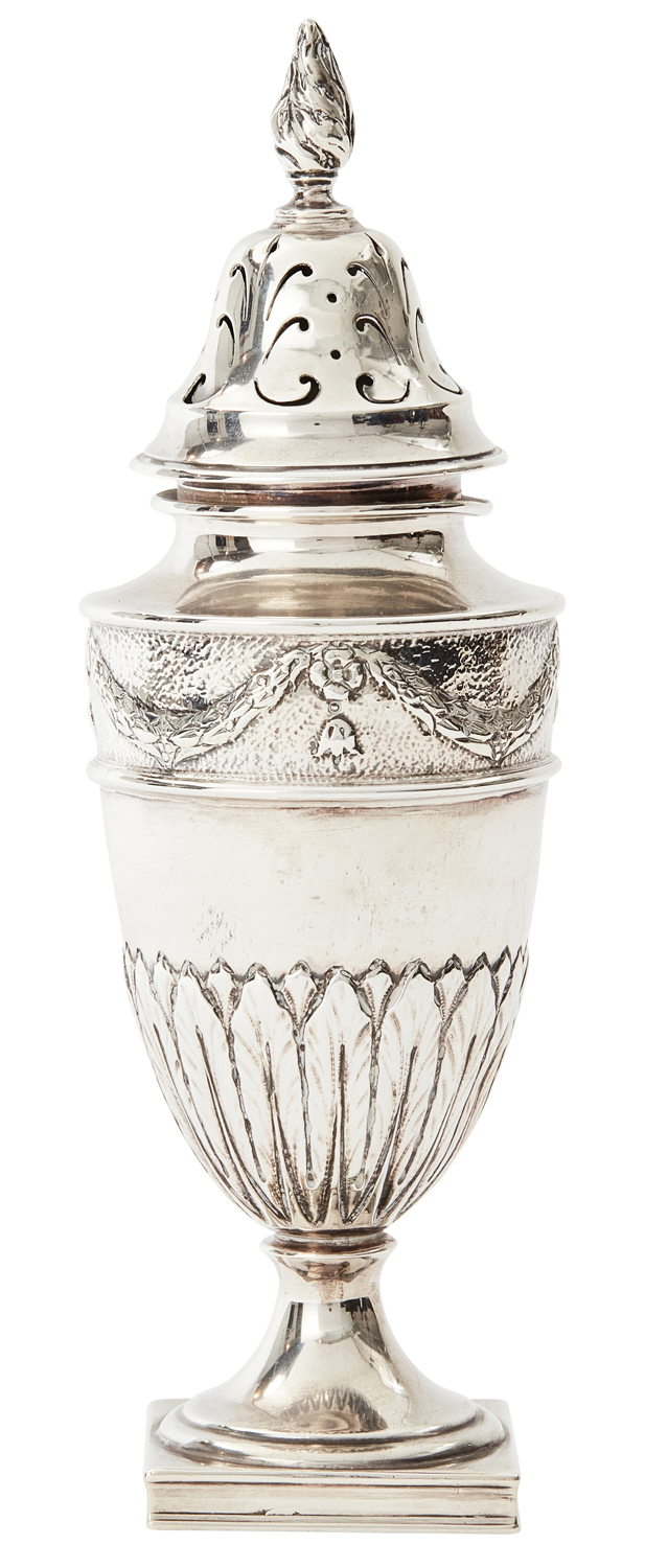 Maker's mark of Daniel & Arter, Birminghan 1905, in Adam revival style, the urn shaped body with stiff leaf and swag decoration, pierced cover and flame finial.