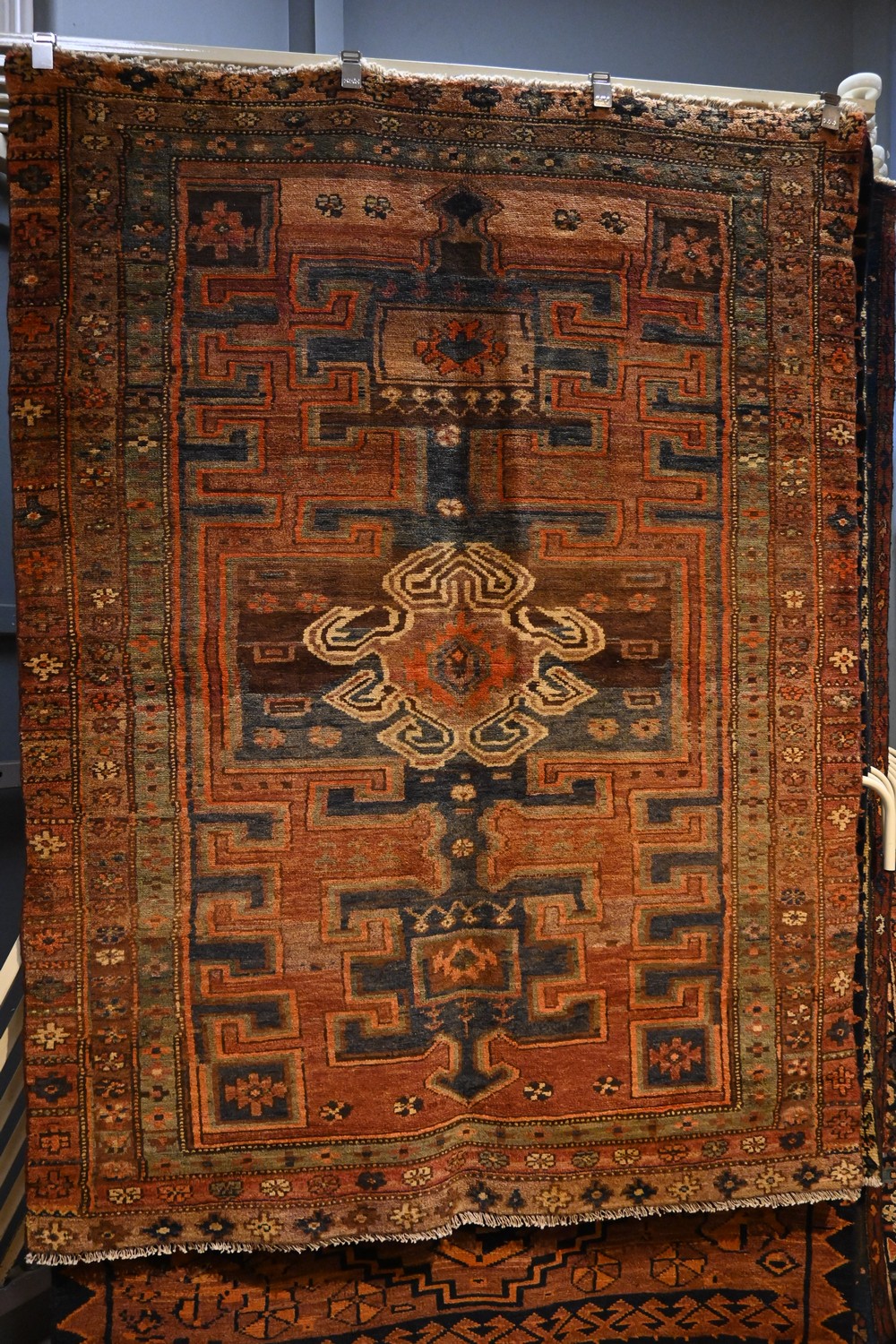 A TRIBAL PERSIAN LURI RUG. 100% WOOL. NATURAL DYES. HAND-KNOTTED TRIBAL WEAVE WITH DESIGN OF CENTRAL ANCHORED MEDALLIONS CONTAINING TRIBAL DESIGNS ON A SOFT FIELD. TRIPLE BORDER OF ROSETTES. ALL OVER SOFT MELLOW TONES AND SOME NATURAL ABRASH. SIZE: 198 X 148 CM ORIGIN: PERSIA - RRP: $2,600 DOCUMENTATION OF AUTHENTICITY INCLUDED.