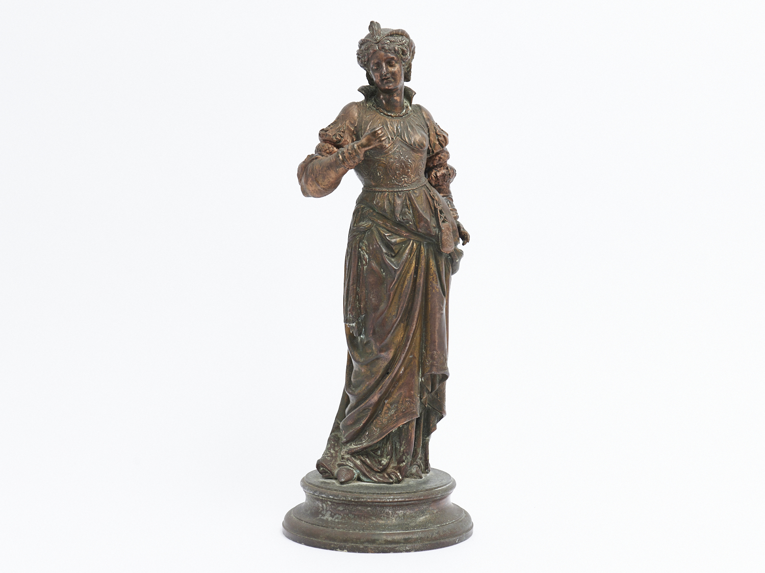 A SPELTER FIGURE OF A LADY WITH BRONZED PATINA H.42CM, LEONARD JOEL LOCAL DELIVERY: MEDIUM