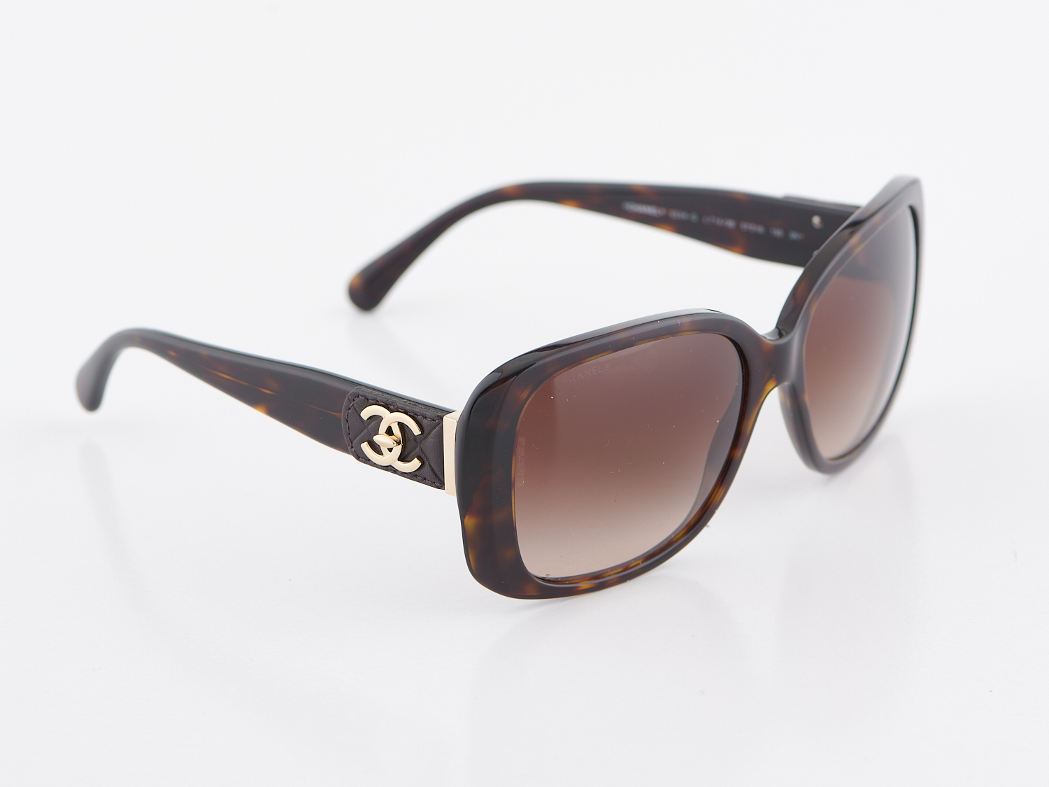 CHANEL, PAIR OF SUNGLASSES - Styled in tortoiseshell acetate with gilt CHANEL logo on quilted brown leather arm detail, with original quilted leather case and box.
