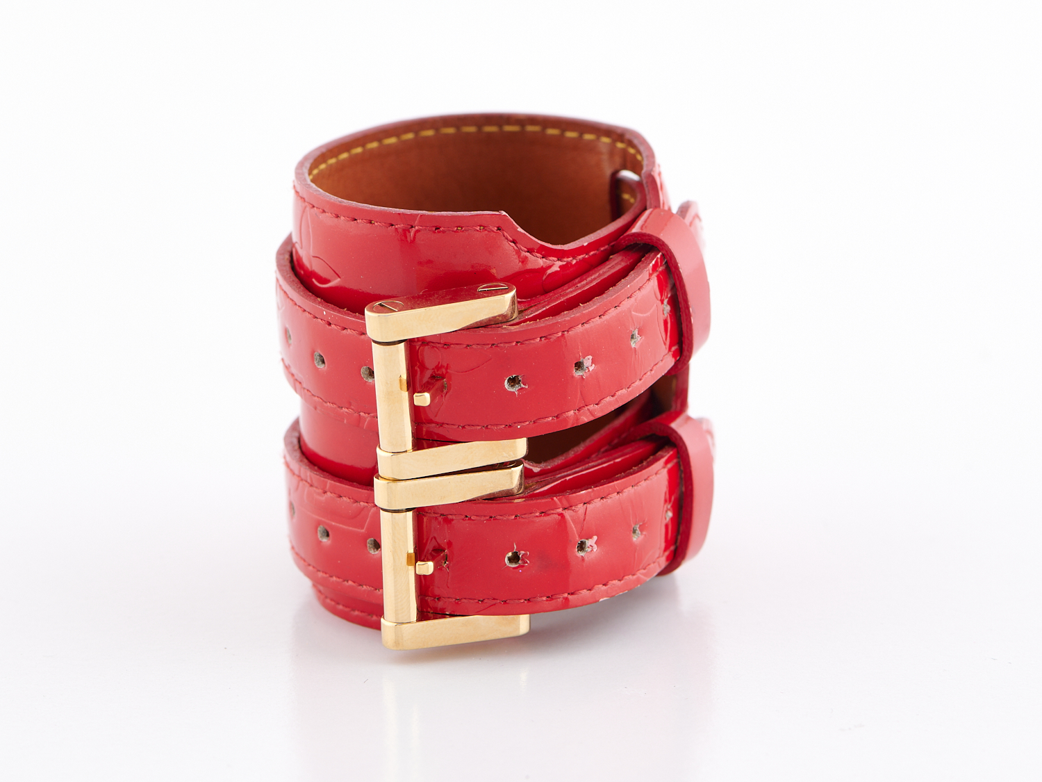 LOUIS VUITTON, CHARLTON CUFF, STYLED IN CHERRY RED VERNIS LEATHER, WITH DOUBLE BUCKLE IN GOLD TONE HARDWARE