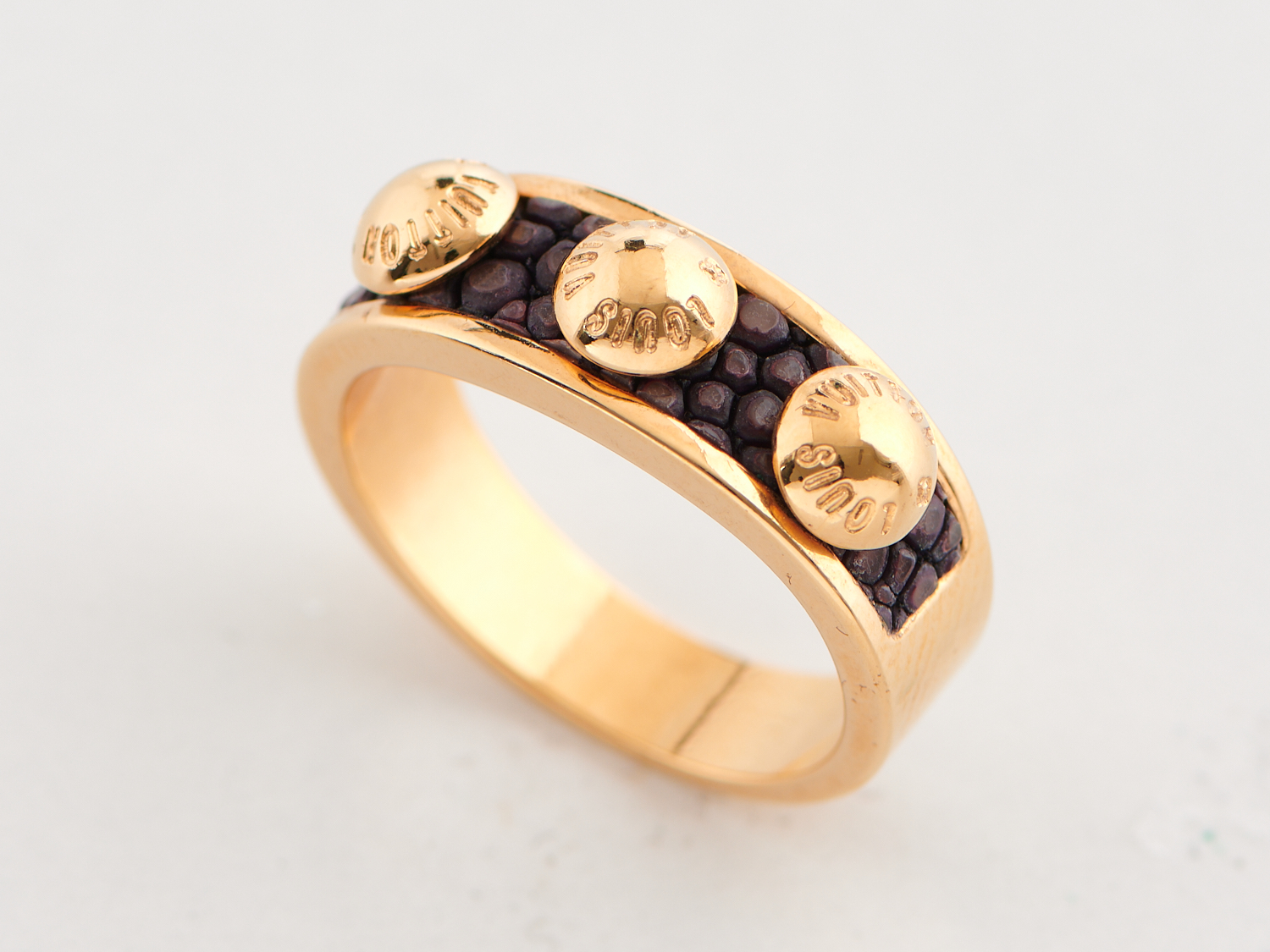 LOUIS VUITTON, 'GIMME A CLUE' RING - Styled in gold tone metal with stingray leather detail, ring size L.