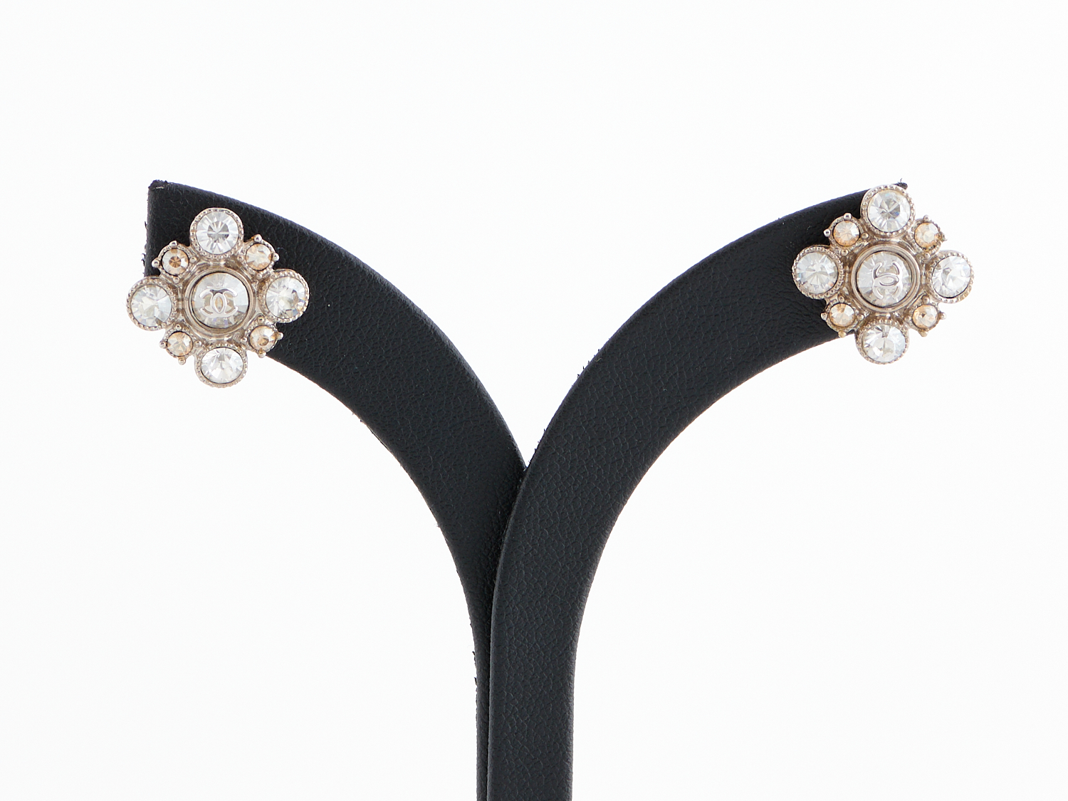 CHANEL, PAIR OF STUDS - Styled featuring crystal embellishments with CC logo centre, to post and butterfly fittings, Spring 2011.