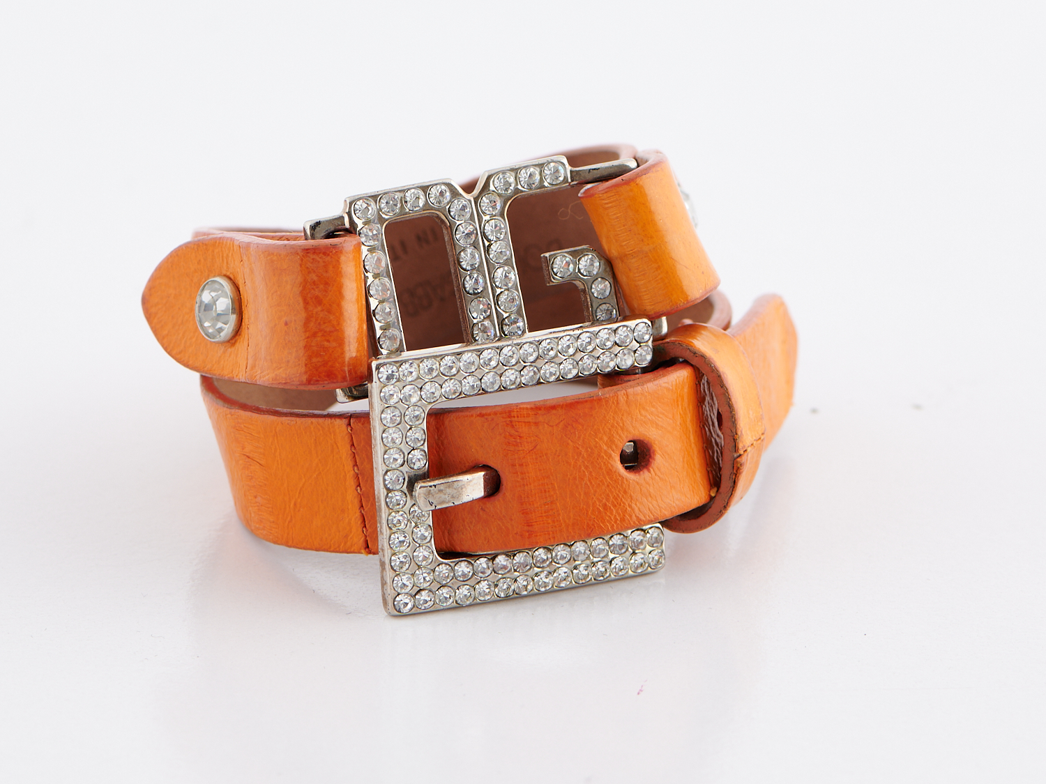 DOLCE & GABBANA, BRACELET - The double tour bracelet styled in orange leather, with silver tone crystal encrusted DG logo and buckle feature.