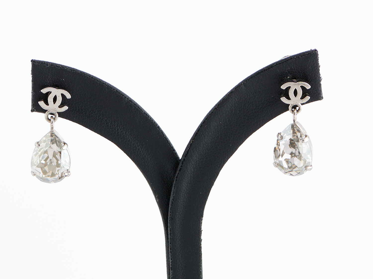 CHANEL, PAIR OF EARRINGS - Styled featuring pear cut crystal drops suspended below CC studs in silver tone metal.