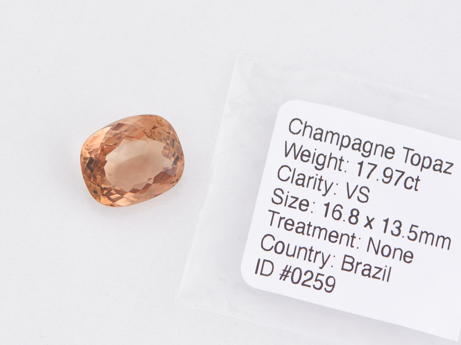 A LOOSE FANCY CUSHION CUT CHAMPAGNE TOPAZ WEIGHING APPROXIMATELY 17.97CTS, APPROXIMATE SIZE 16.8 X 13.5MM, VS, NO HEAT TREATMENT
