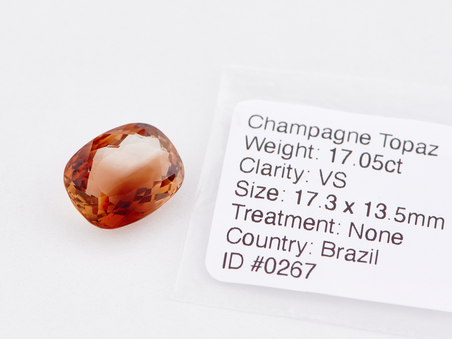 A LOOSE CHAMPAGNE FANCY CUSHION CUT TOPAZ WEIGHING 17.05CTS, 17.3 X 13.5MM, VS, NO HEAT TREATMENT