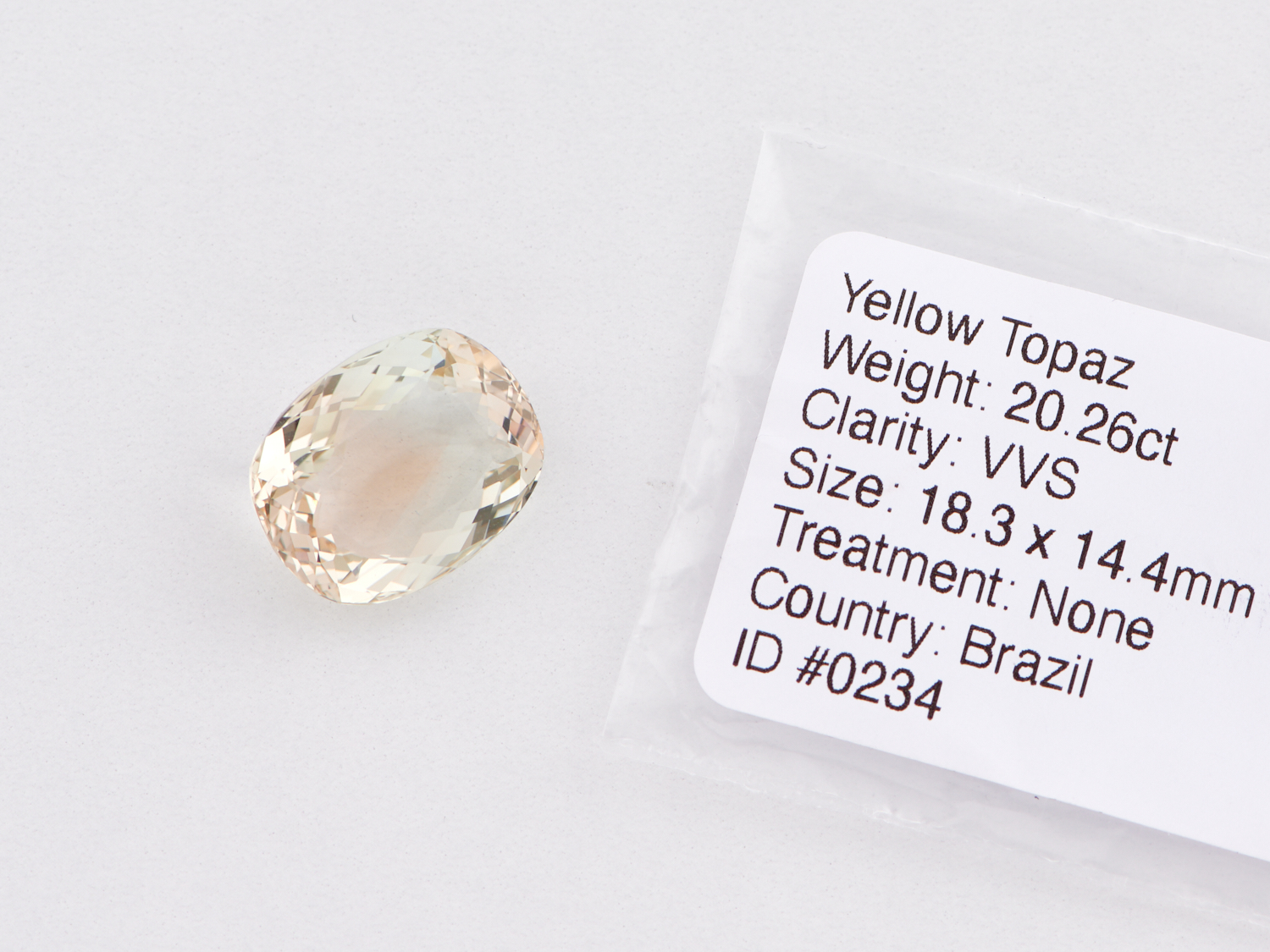 A LOOSE YELLOW FANCY CUSHION CUT TOPAZ WEIGHING 20.26CTS, 18.3 X 14.4MM, VVS, NO HEAT TREATMENT