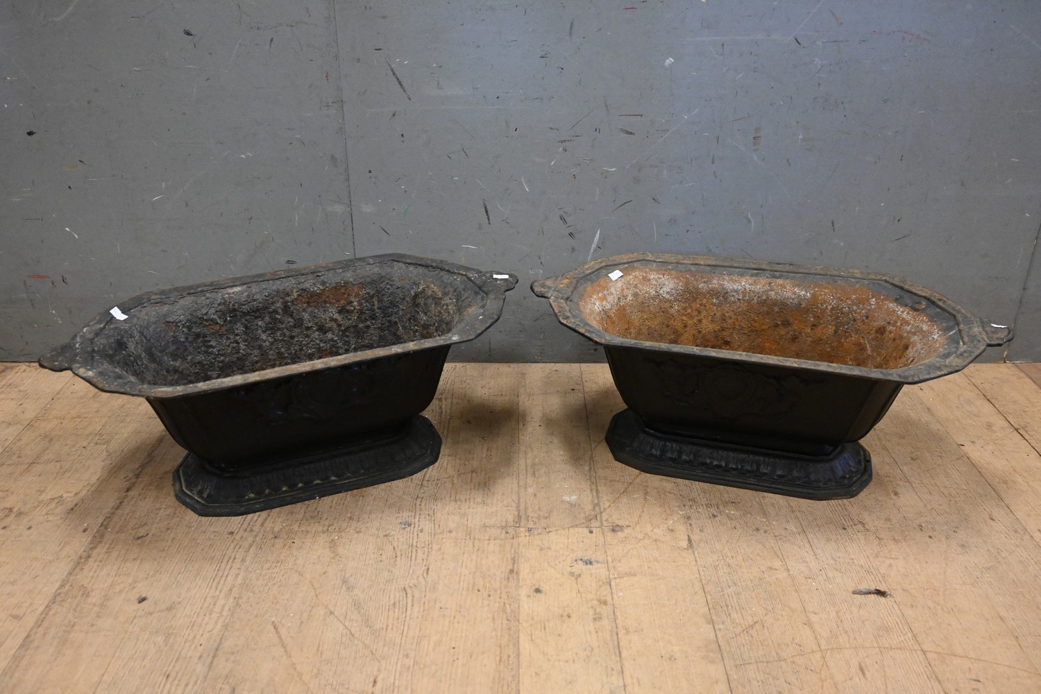 A PAIR OF 19TH CENTURY FRENCH CAST IRON PLANTERS WITH RAISED FOLIATE DETAIL TO SIDES (23H X 63W X 33D CM) (PLEASE NOTE THIS HEAVY ITEM MUST BE REMOVED BY CLIENTS OR CARRIERS AT THE CUSTOMERS EXPENSE. LEONARD JOEL STAFF CANNOT ASSIST CARRYING THIS ITEM)