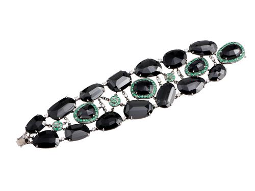 The wide openwork strap, set throughout with eighteen fancy-cut black spinels together weighing approxiamtely 150 carats, the central row within surround of circular-cut emeralds together weighing approximately 3.60 carats and decorated throughout with nineteen brilliant-cut diamonds together weighing approximately 1.14 carats, completed by a box clasp, signed Cerrone, length approximately 180mm.