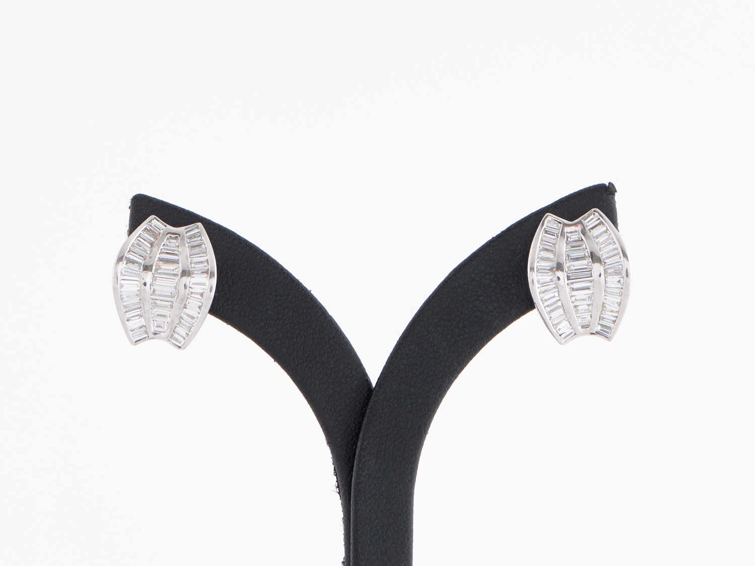 A PAIR OF BAGUETTE CUT DIAMOND SET EARRINGS IN 18CT WHITE GOLD TO POST AND BUTTERFLY FITITNGS, APPROXIMATE SIZE 12 X 16MM, APPROXIMATE WEIGHT 5.2GMS