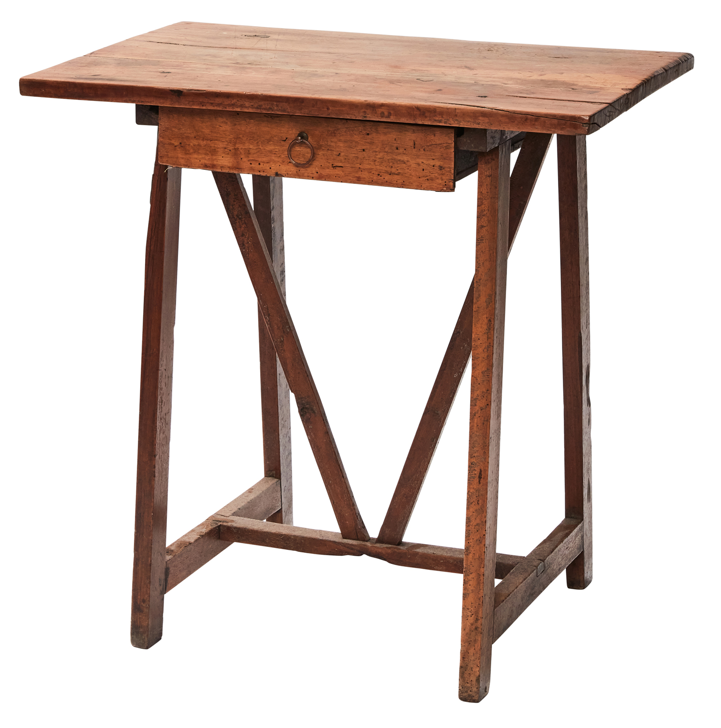 Splits, stains, cracks and areas of infill to top; worm holes to drawer front; diagonal stretcher broken on one side, faded and stained throughout.