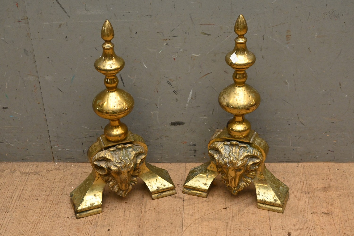 A PAIR OF BRASS FIRE DOGS WITH RAMS HEAD DETAILING (50H CM) (LEONARD JOEL DELIVERY SIZE: LARGE)