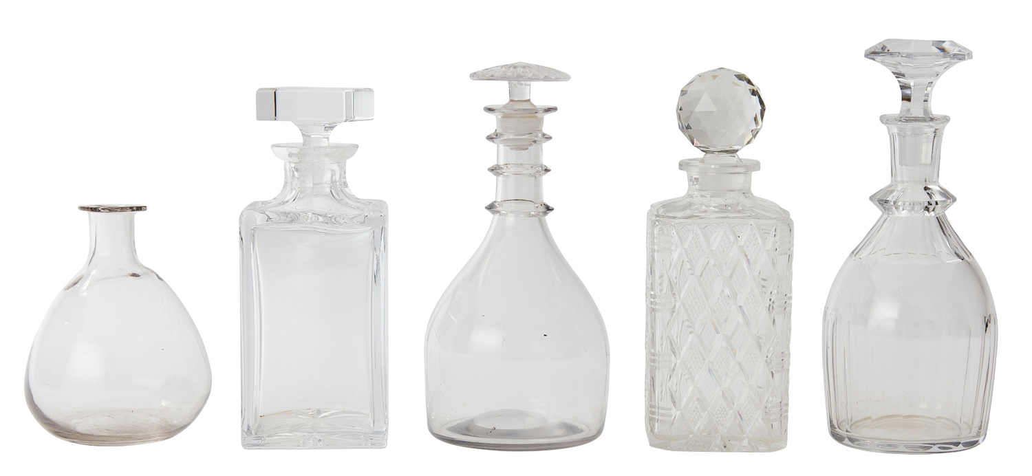 Comprising a plain Georgian example with mushroom stopper and triple ring neck, a Victorian example with fluted cutting, a plain square example and another diamond cut square example, and a pear shaped carafe without stopper. (5)