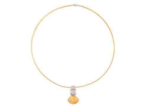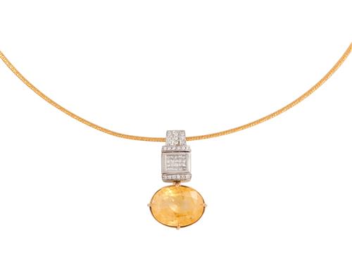 A SAPPHIRE AND DIAMOND PENDANT IN TWO-TONE 14CT GOLD, COMPRISING A CLAW-SET YELLOW SAPPHIRE WEIGHING 25.25 CARATS, BELOW A REVERSIBLE PANEL SET WITH INVISIBLY-SET SQUARE-CUT RUBIES TOGETHER WEIGHING APPROXIMATELY 0.60 CARATS AND INVISIBLY SET-PRINCESS-CUT DIAMONDS, THE SURROUND AND BALE WITH BRILLIANT-CUT DIAMONDS, THE DIAMONDS TOGETHER WEIGHING APPROXIMATELY 0.71 CARATS, LENGTH APPROXIMATELY 34MM, TO A REVERSIBLE OMEGA CHAIN IN TWO-TONE 9CT GOLD, LENGTH APPROXIMATELY 510MM, ACCOMPANIED BY GSL GEMSTONE AUTHENTICATION REPORT NUMBER AA66364 DATED 10TH JUNE 2021 STATING THE 25.25 CARAT SAPPHIRE HAS NO EVIDENCE OF HEAT TREATMENT IDENTIFIED, ORIGIN CEYLON.