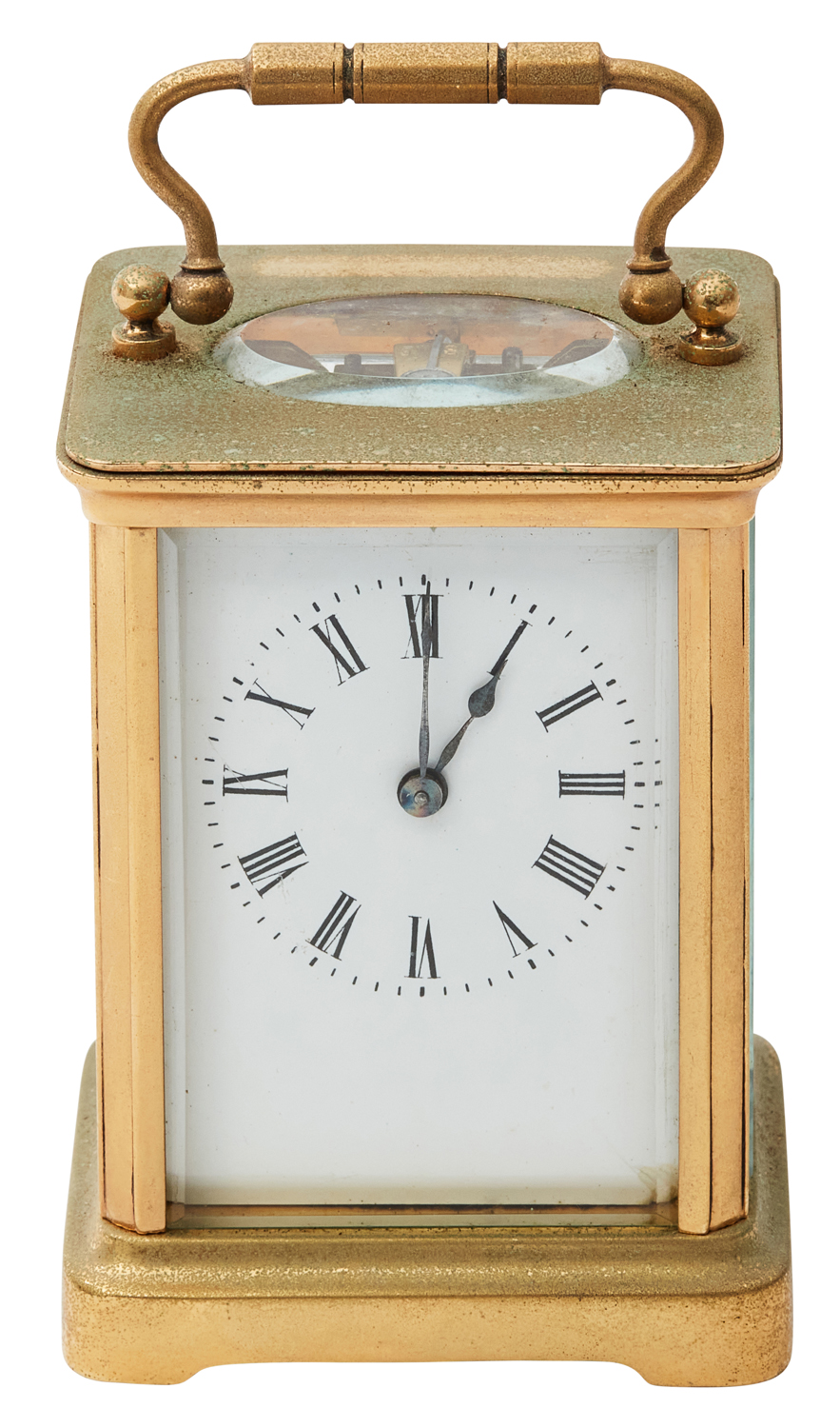 With bevelled glass panel sides, the white enamel dial with Roman numerals.