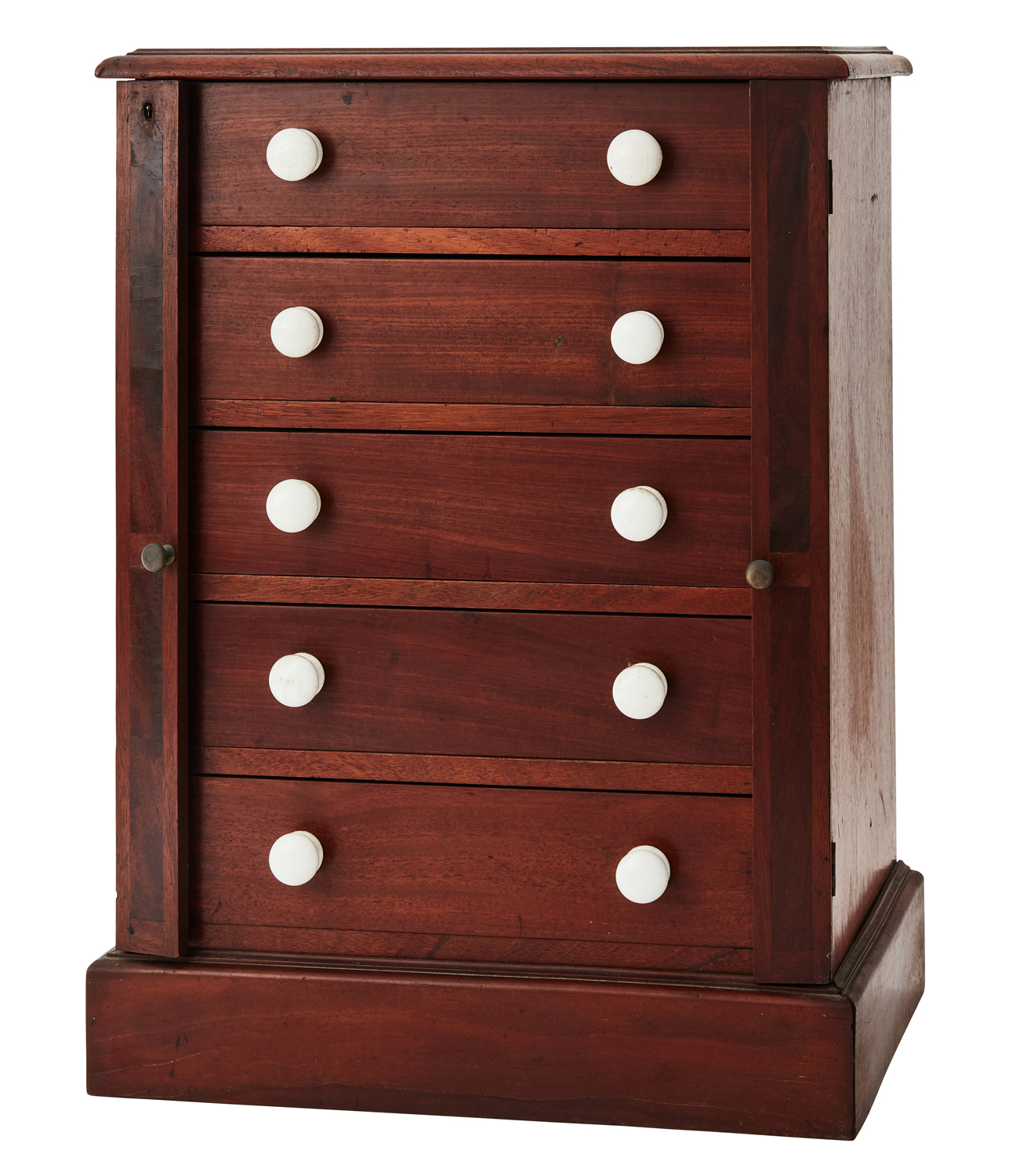 Having five drawers with porcelain knobs and lockable stiles on a plinth base.