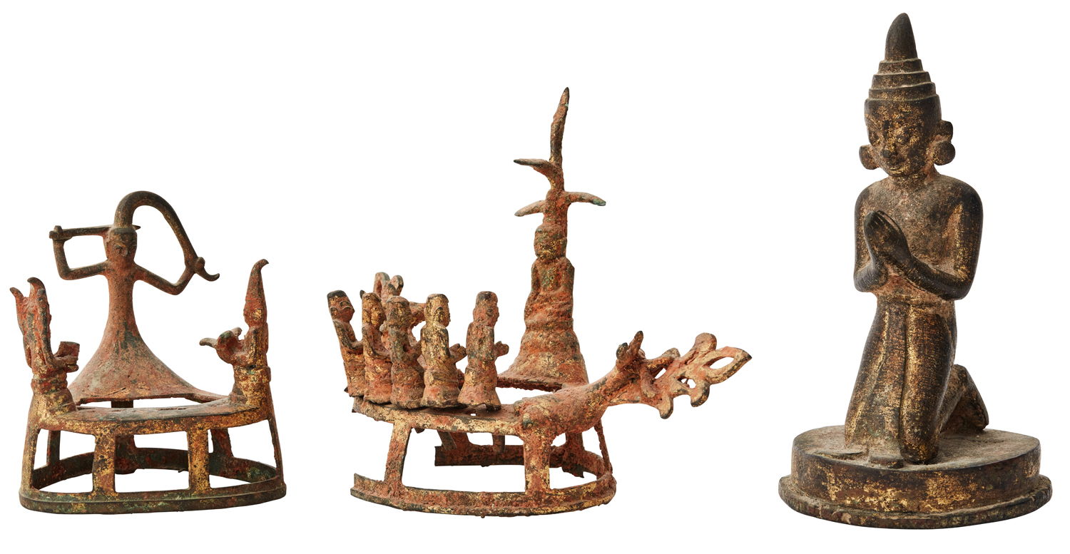 TWO BURMESE GILT BRONZE GROUPS AND A GILT BRONZE KNEELING MONK