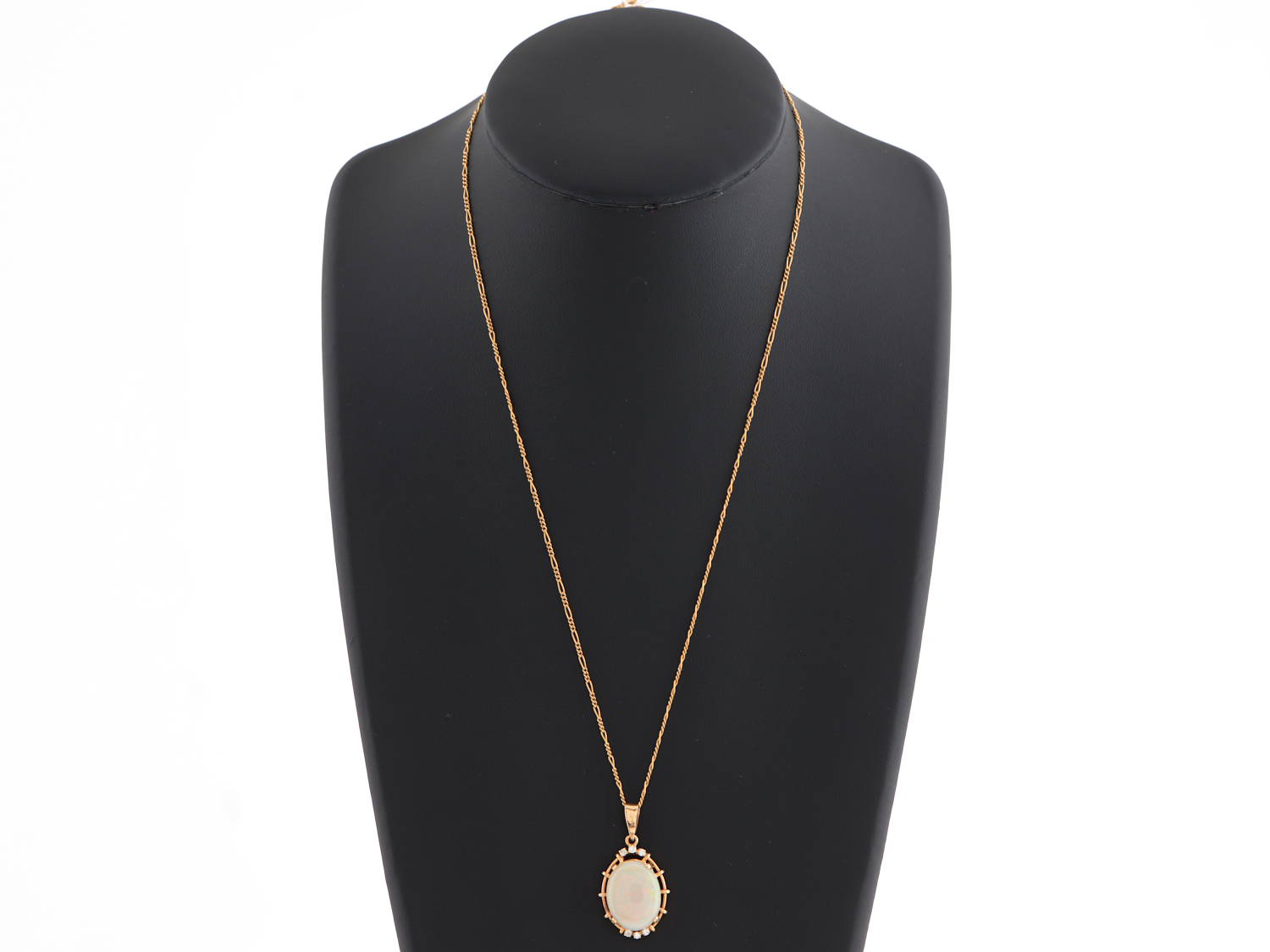 A LIGHT SOLID OPAL AND DIAMOND SET PENDANT IN 14CT GOLD, TO A GOLD PLATED CHAIN, THE OPAL MEASURING APPROXIMATELY 18 X 14MM