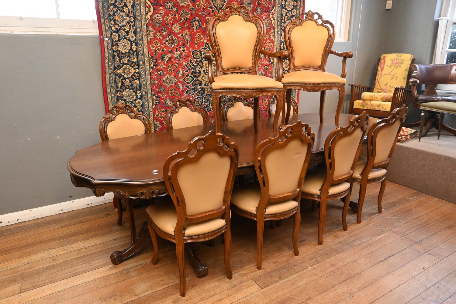 A CARVED TIMBER ELEVEN PIECE DINING SETTING (A/F) ( 80H X 320W X 125W CM) (PLEASE NOTE THIS HEAVY ITEM MUST BE REMOVED BY CLIENTS OR CARRIERS AT THE CUSTOMERS EXPENSE. LEONARD JOEL STAFF CANNOT ASSIST CARRYING THIS ITEM)