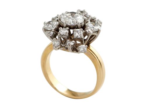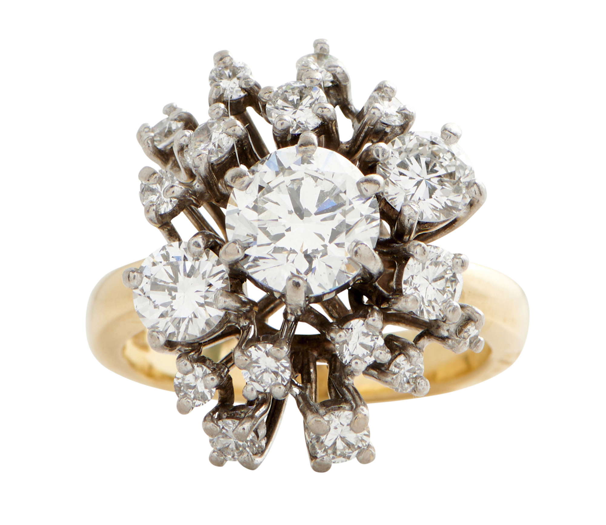 Of cluster design centring a claw-set brilliant-cut diamond weighing approximately 1.40 carats, within an asymmetric surround of seventeen further claw-set brilliant-cut diamonds together weighing approximately 1.65 carats, size L.