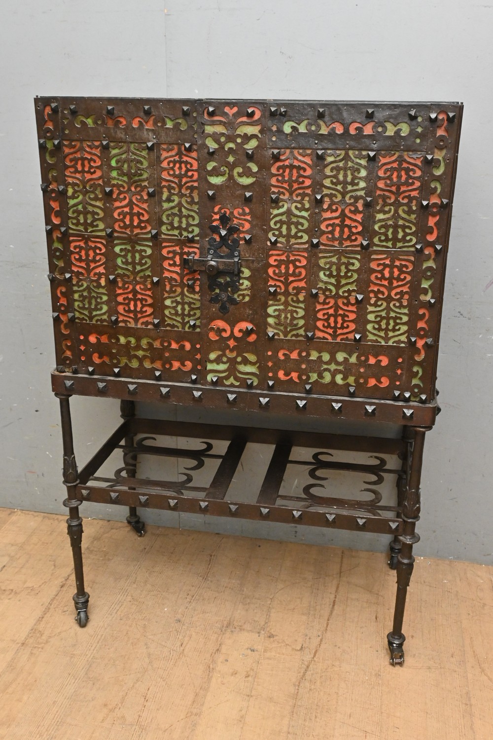 A SPANISHED BLACKSMITHED 'VARGUENO' CABINET IN FORGED WROUGHT IRON ( 139H X 95W X 51D CM) (PLEASE NOTE THIS HEAVY ITEM MUST BE REMOVED BY CLIENTS OR CARRIERS AT THE CUSTOMERS EXPENSE. LEONARD JOEL STAFF CANNOT ASSIST CARRYING THIS ITEM)