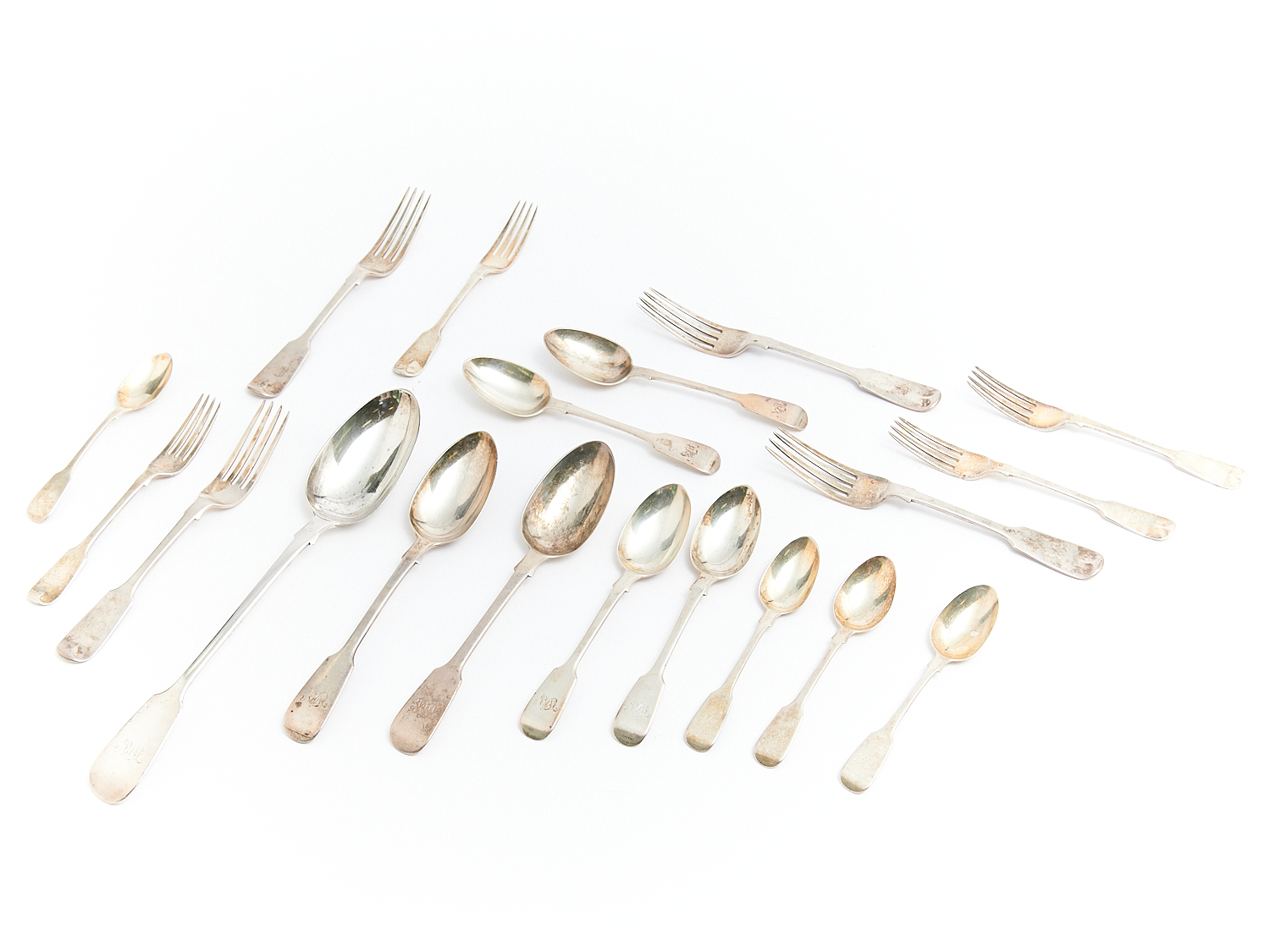 A STERLING SILVER FLATWARE SETTING FOR FOUR, TOGETHER WITH THREE SERVING SPOONS, HALLMARKED LONDON BY GEORGE ADAMS, (NO KNIVES), LEONARD JOEL LOCAL DELIVERY: SMALL