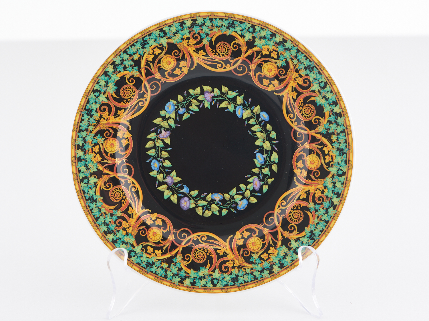 ROSENTHAL FOR VERSACE, LIMITED EDITION GOLD IVY WALL PLATE - The porcelain wall plate styled featuring a green ivy border, encompasing an ornamental plant wreath to the center, 11 x 18.4 x 18.4cm.