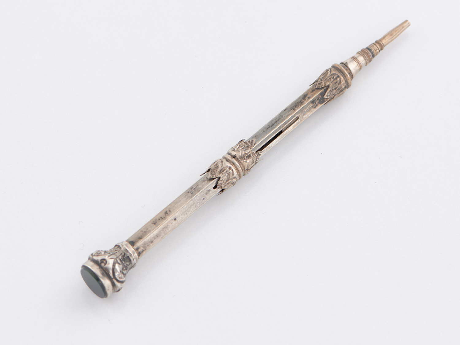 A VICTORIAN SILVER PROPELLING PENCIL WITH A BLOODSTONE SET TOP, APPROXIMATE LENGTH 120MM, APPROXIMATE WEIGHT 15.9GMS