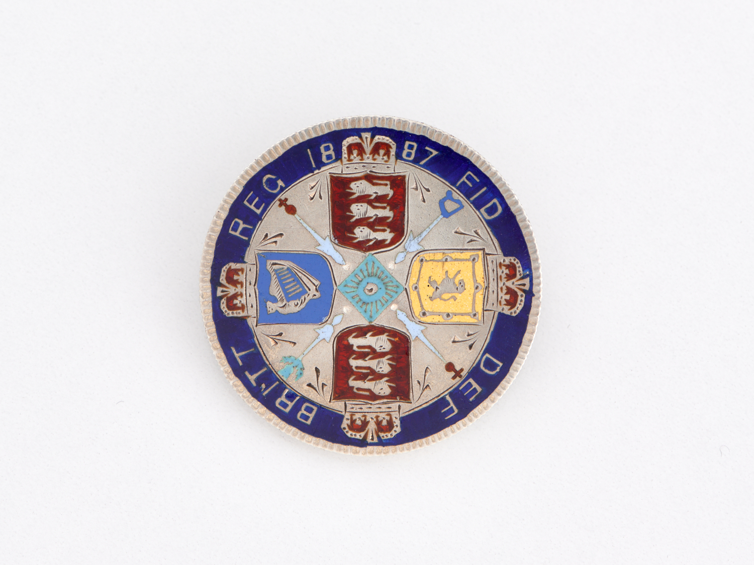 A VICTORIAN ENAMELLED COIN BROOCH DATED 1887, DIAMETER 36MM
