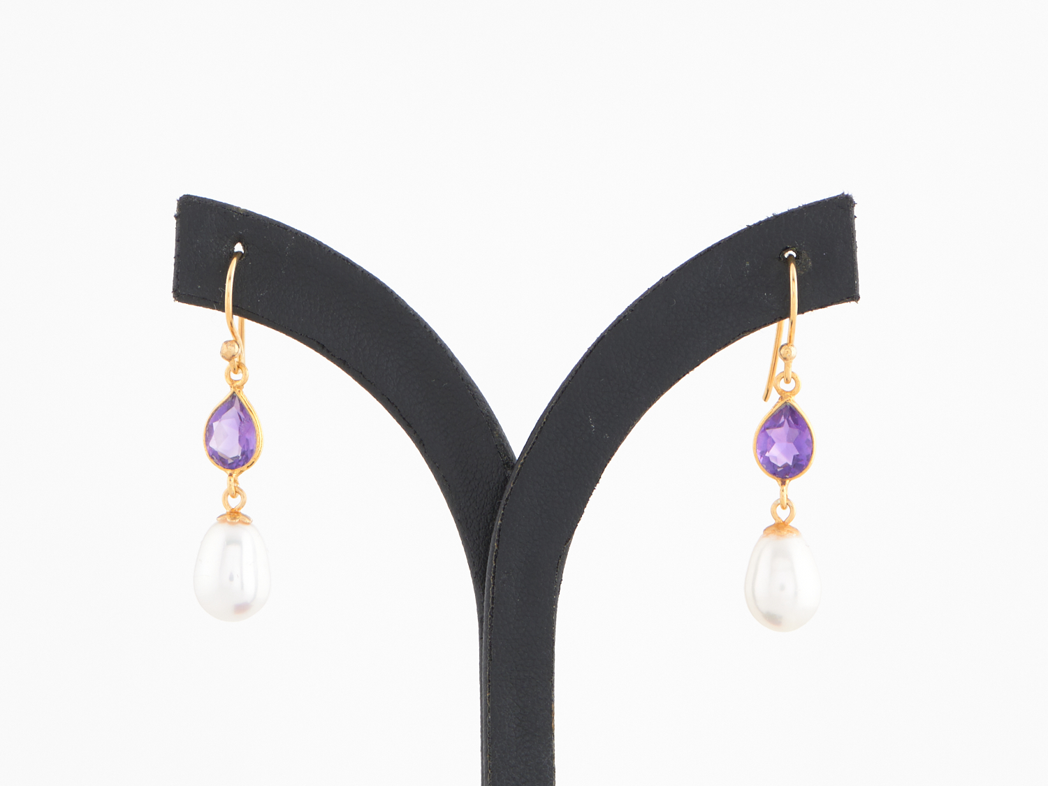 A PAIR OF AMETHYST AND CULTURED PEARL DROP EARRINGS IN GOLD PLATED STERLING SILVER, TO SHEPHERD HOOK FITTINGS, LENGTH 37MM