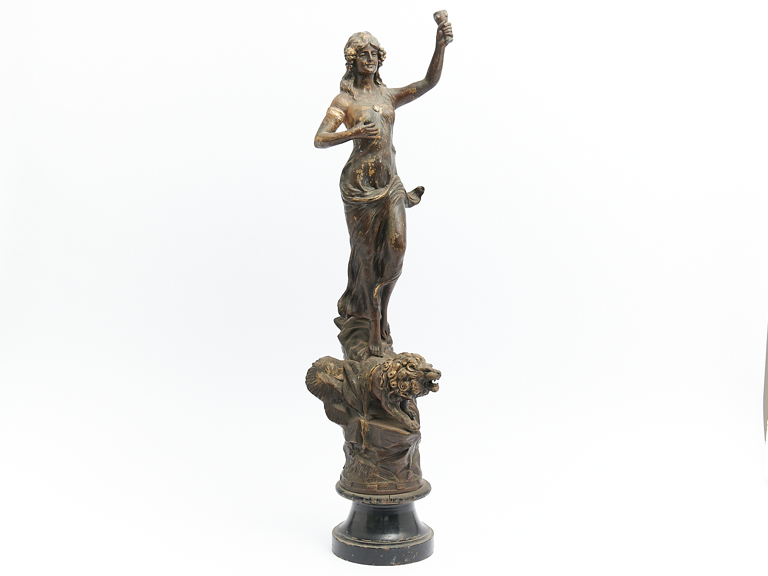 A SPELTER FIGURE OF A LADY ATOP LION H.70CM (A/F), LEONARD JOEL LOCAL DELIVERY: MEDIUM