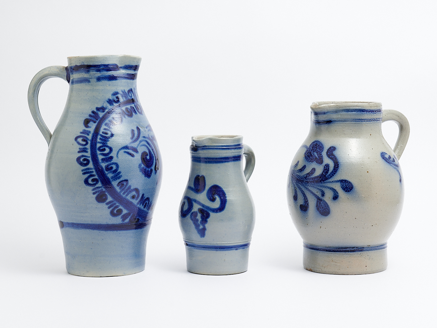 A GROUP OF THREE DUTCH SALT GLAZED JUGS H.36 CM (TALLEST), LEONARD JOEL LOCAL DELIVERY: MEDIUM