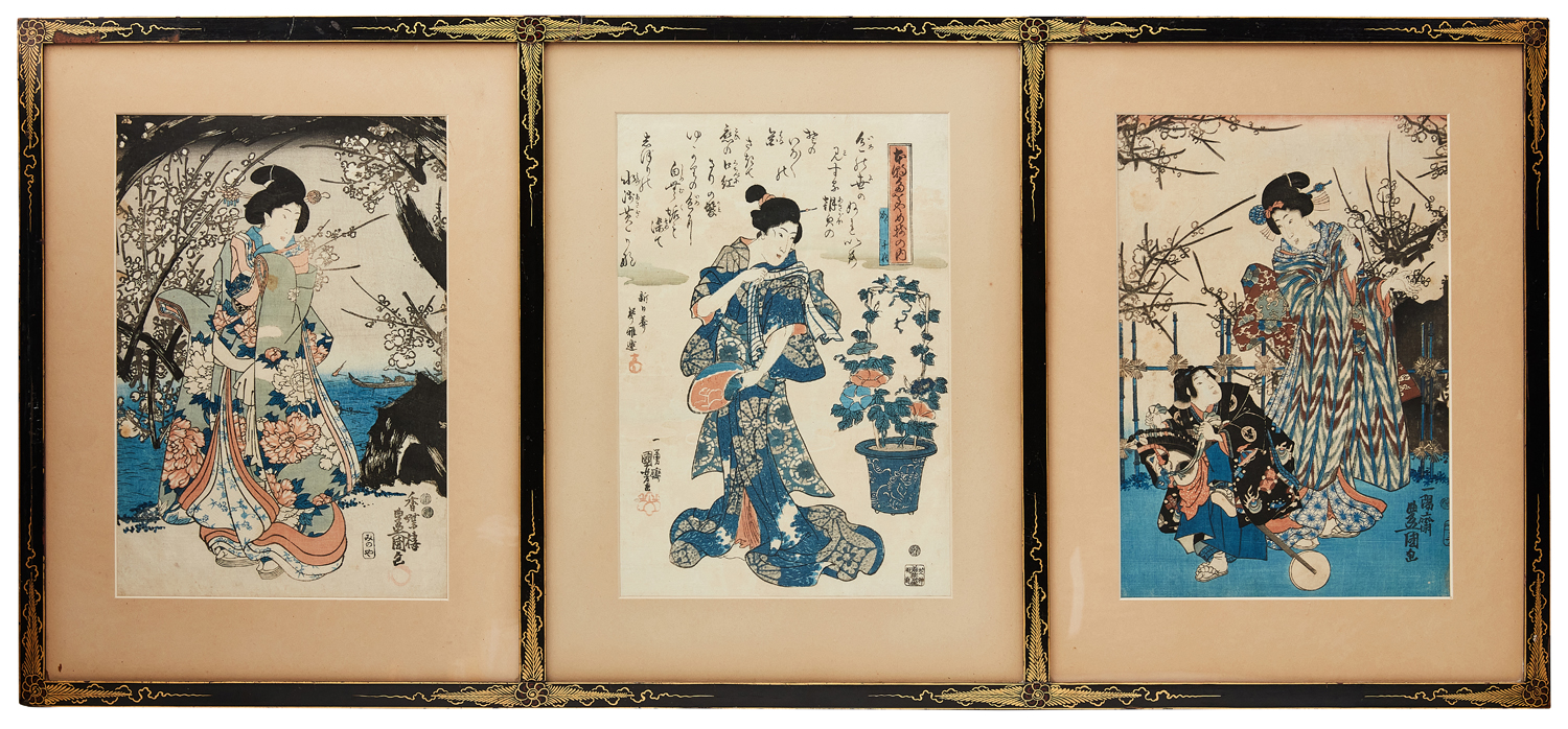The first an Oban tate-e of a beauty in elaborate Kimono by the seaside and beneath blossom, signed Kochoro Toyokuni, c.1849-1853; the second an Oban tate-e of a beauty next to a potted Morning Glory, signed Kuniyoshi with Yoshi Kiri seal, c.1851; the third, an Oban tate-e of a beauty with a young boy practicing his hobby-horse dance, signed Ichiyosai Toyokuni III c.1850, the frame with attractive gold lacquer highlights.