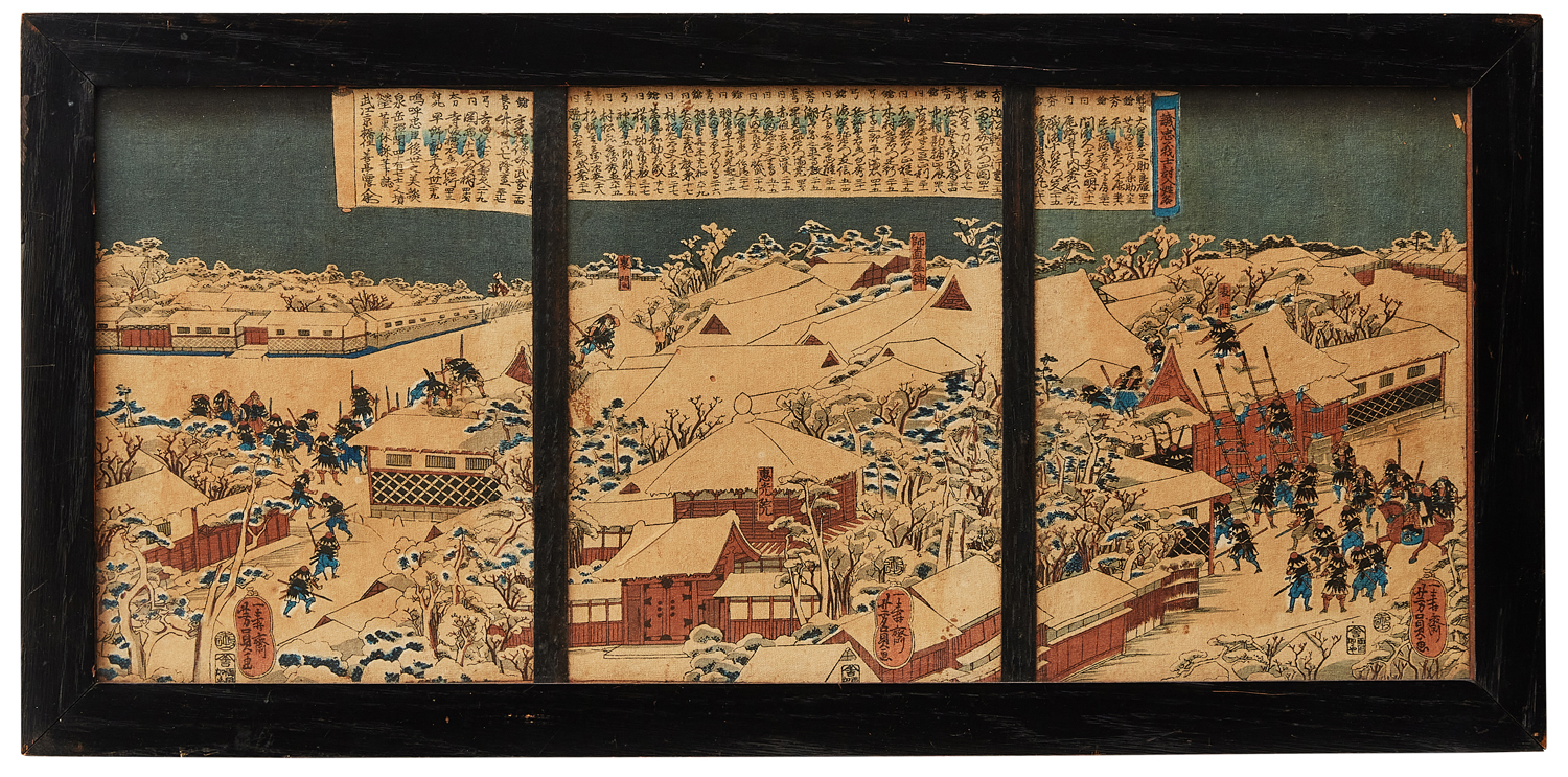 Framed triptych of the battle 'Chushingura, The Loyal Retainers Take Their Revenge, with List of Names', Oban tate-e, signed Ichiyusai Yoshikazu.