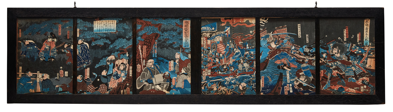 Framed in one continuous section, two dynamic battle prints, from left to right: a scene from 'At the Lookout Pine Tree, the Bandits Plot against the Kaneuri Brothers (Gôzokura no monomi no matsu ni Kaneuri kyôdai o hakaran to su): The Story of Ushiwakamaru and Kumasaka Chôhan, signed Yoshitsuya, c.1864; the second Leaping 8 Boats - The Showdown at Dannoura with the Minamoto general Yoshitsune escaping the hand of the Heike warrior lord Noto-no-kami Noritsune by leaping 8 boats, signed Kunitsuna, c.1860's.
