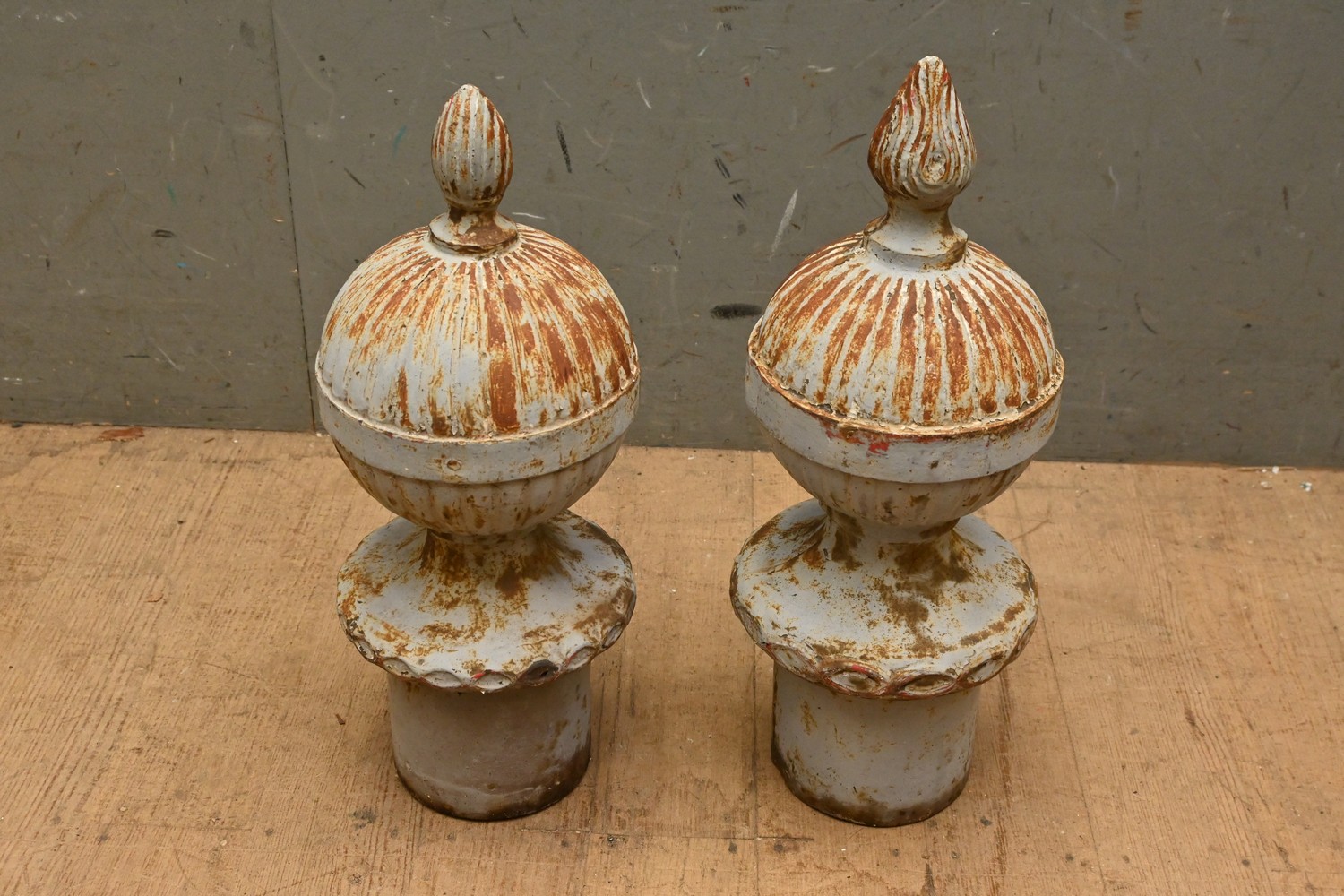 A PAIR OF 19TH CENTURY FRENCH CAST-IRON SPHERICAL GATE POST FINIALS - NOT MATCHING (50H CM) (PLEASE NOTE THIS HEAVY ITEM MUST BE REMOVED BY CLIENTS OR CARRIERS AT THE CUSTOMERS EXPENSE. LEONARD JOEL STAFF CANNOT ASSIST CARRYING THIS ITEM)