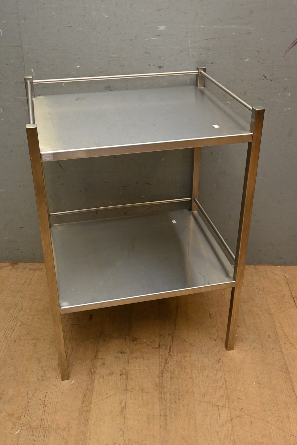 A TWO TIER STAINLESS STEEL HOSPITAL TABLE WITH GALLERY TOP (86H X 60W X 49D CM) (LEONARD JOEL DELIVERY SIZE: LARGE)