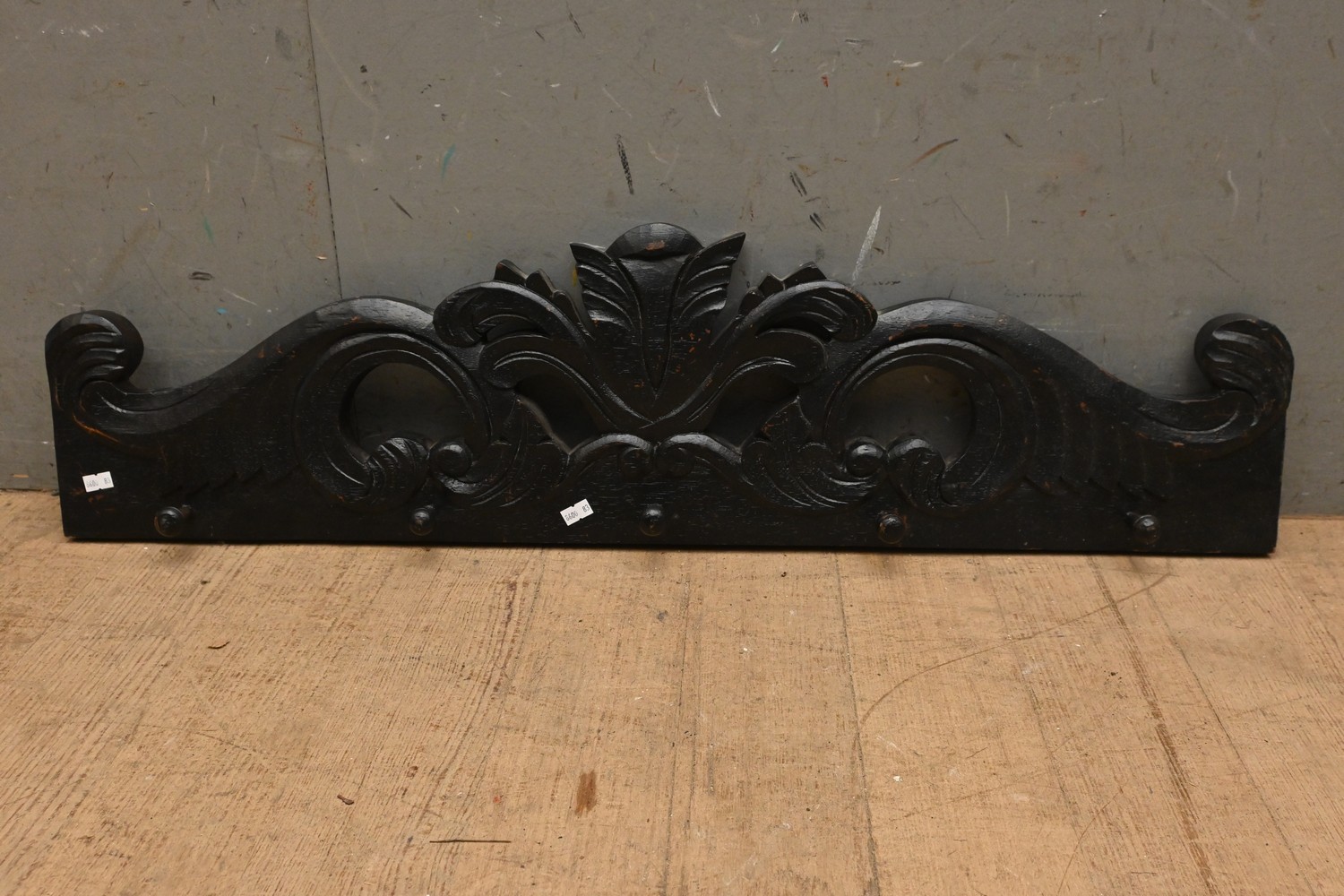 A VINTAGE CARVED WOODEN FIVE HOOK WALL MOUNTED COAT/HATSTAND (23H X 91W CM) (LEONARD JOEL DELIVERY SIZE: MEDIUM)