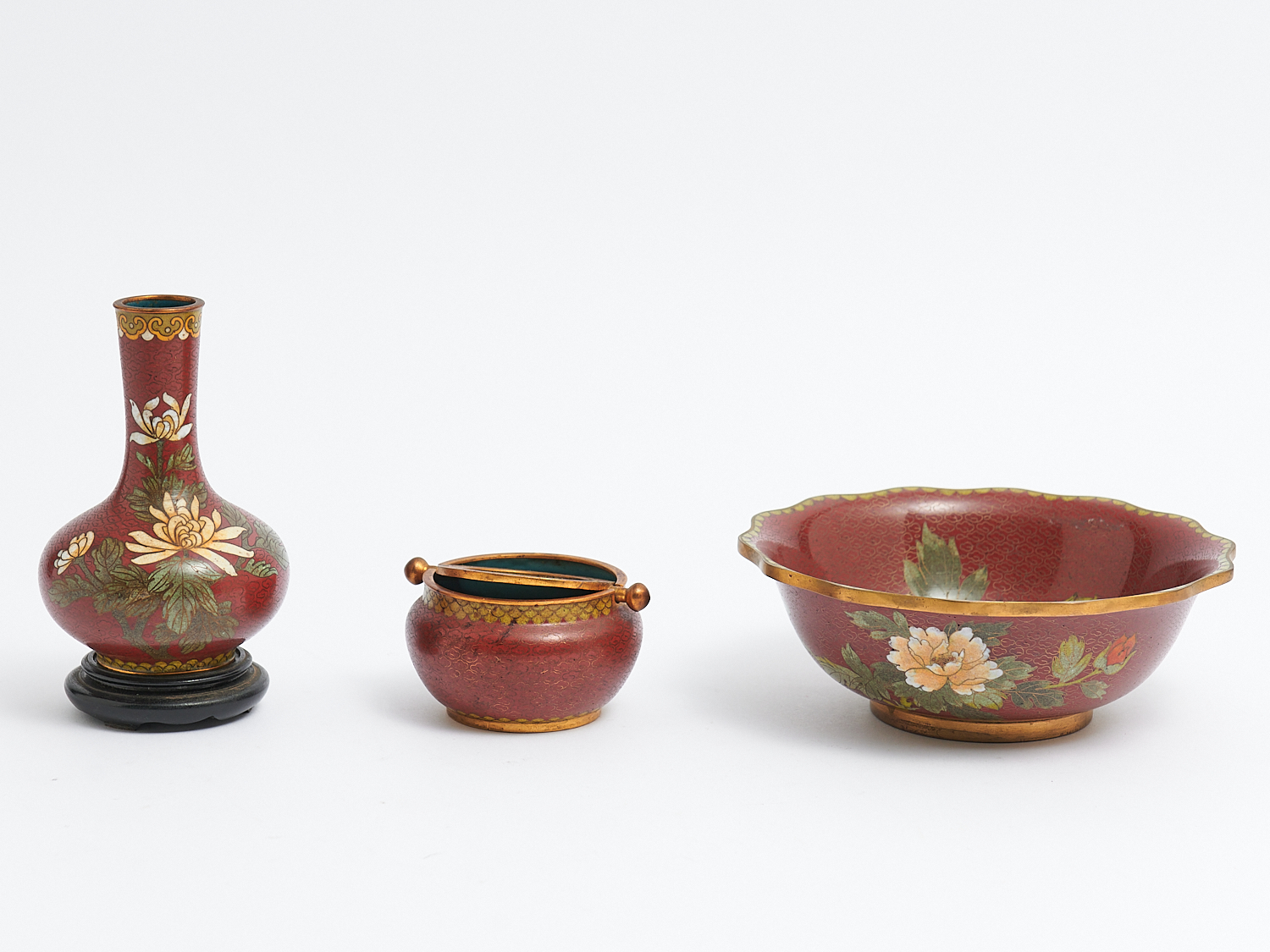 THREE 20TH CENTURY CHINESE OX BLOOD GROUND FLORAL CLOISONNE PIECES INCLUDING BOWL AND VASE, DIA.17.5CM, LEONARD JOEL LOCAL DELIVERY: SMALL