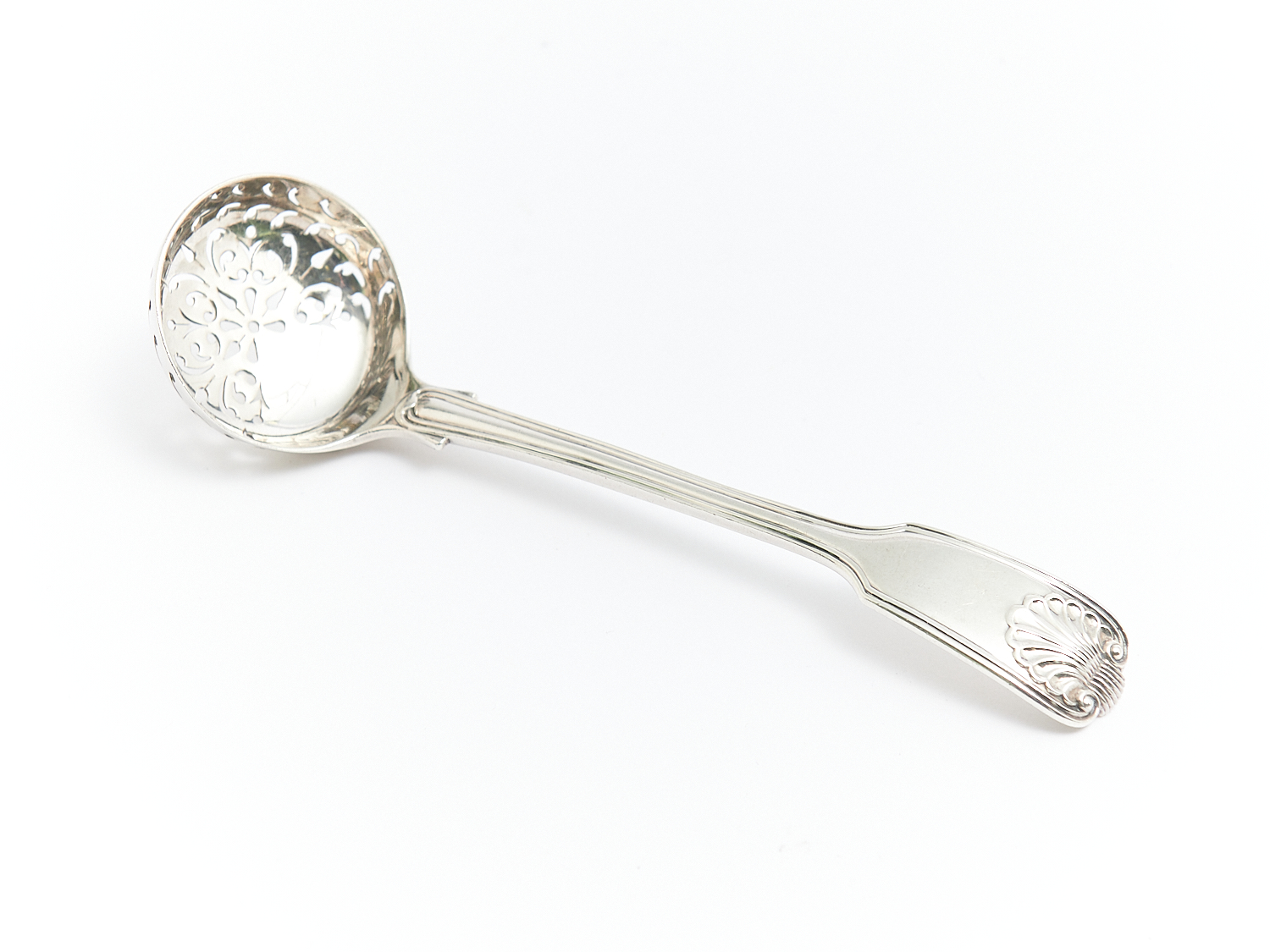 A VICTORIAN STERLING SILVER DOUBLE STRUCK SHELL AND THRED PATTERN SIFTING SPOON, 65 GRAMS, L.16CM, LEONARD JOEL LOCAL DELIVERY: SMALL