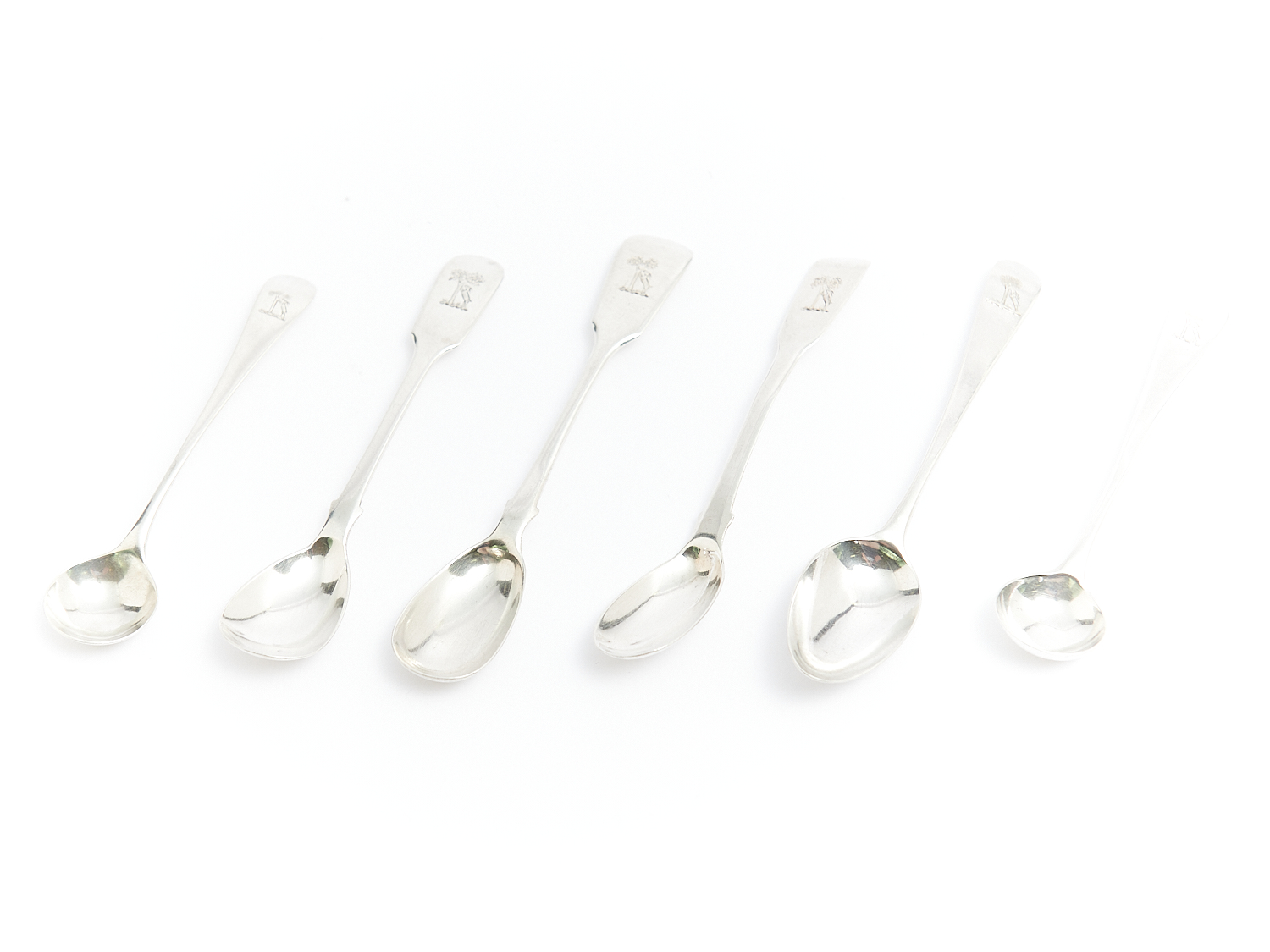SIX GEORGIAN STERLING SILVER SALT AND CONDIMENT SPOONS ALL WITH THE SAME CREST OF A GOAT AND TREE, LEONARD JOEL LOCAL DELIVERY: SMALL