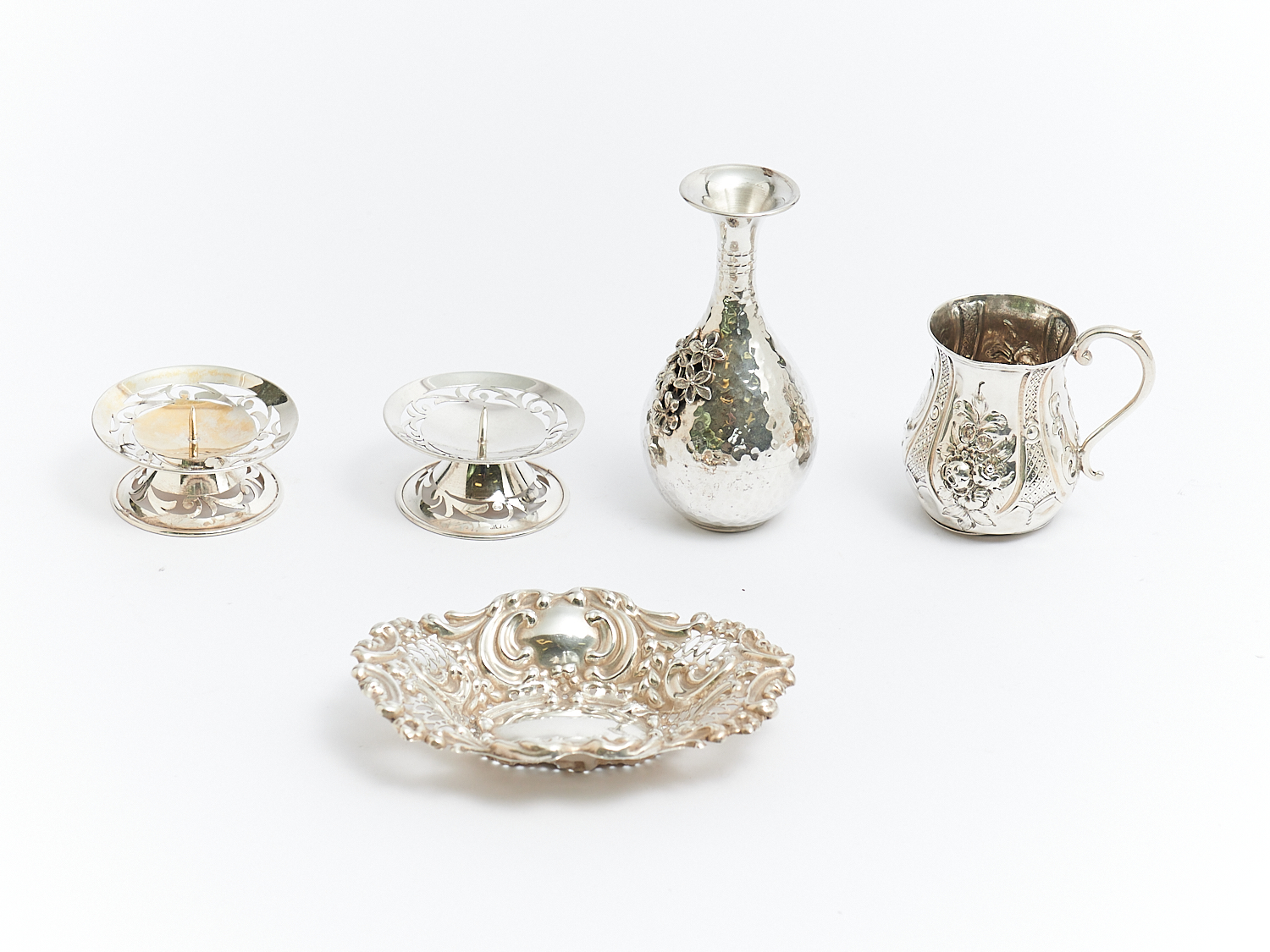 A COLLECTION OF SILVER INCLUDING CANDLESTICKS, VICTORIAN CHRISTENING MUG AND FLOWER ADORNED VASE –APPROX 250 GRAMS, H.10.5CM, LEONARD JOEL LOCAL DELIVERY: SMALL