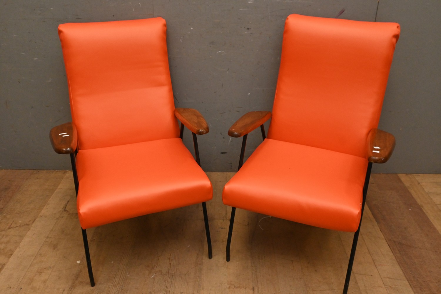 A PAIR OF MID CENTURY ARMCHAIRS IN POP ORANGE VINYL FABRIC (93H X 66W X 80D CM) (LEONARD JOEL DELIVERY SIZE: X-LARGE)