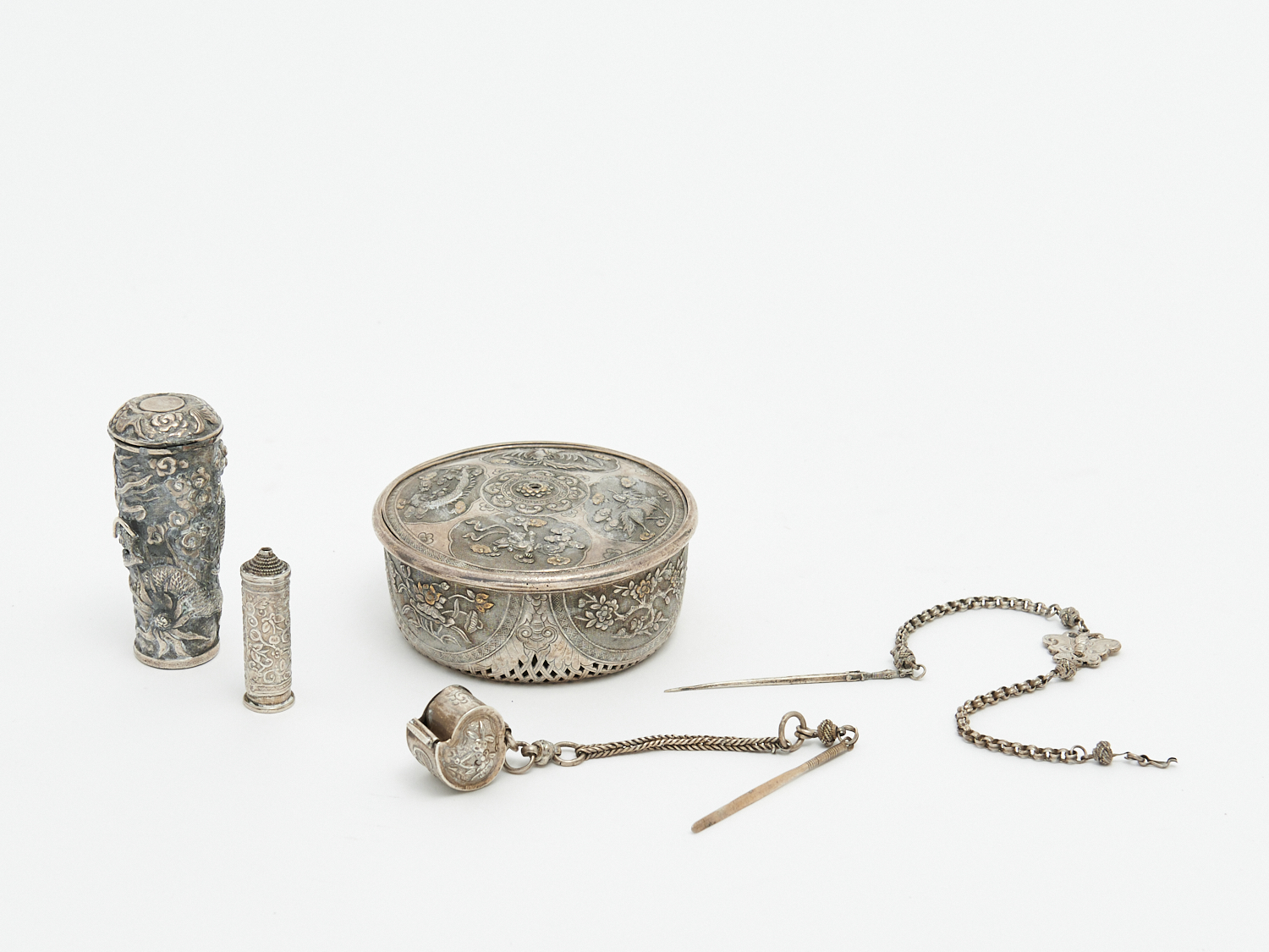 A GROUP OF VIETNAMESE SILVER INCLUDING BETEL NUT IMPLEMENTS AND SILVER REPOUSSE AND PARCEL GILT LIDDED BOX (A/F) DIA.9.5CM, LEONARD JOEL LOCAL DELIVERY: SMALL