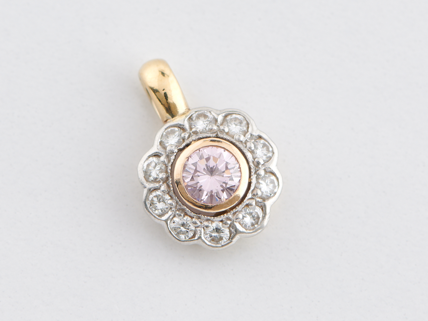 A FANCY NATURAL PINK ARGYLE DIAMOND AND DIAMOND PENDANT IN 18CT GOLD AND PLATINUM, FEATURING A CENTRAL BEZEL SET ROUND BRILLIANT CUT FANCY NATURAL ARGYLE TOTALLING 0.35CTS (P1, 5BP), WITH A SURROUND OF BRILLIANT CUT DIAMONDS TOTALLING 0.27CTS