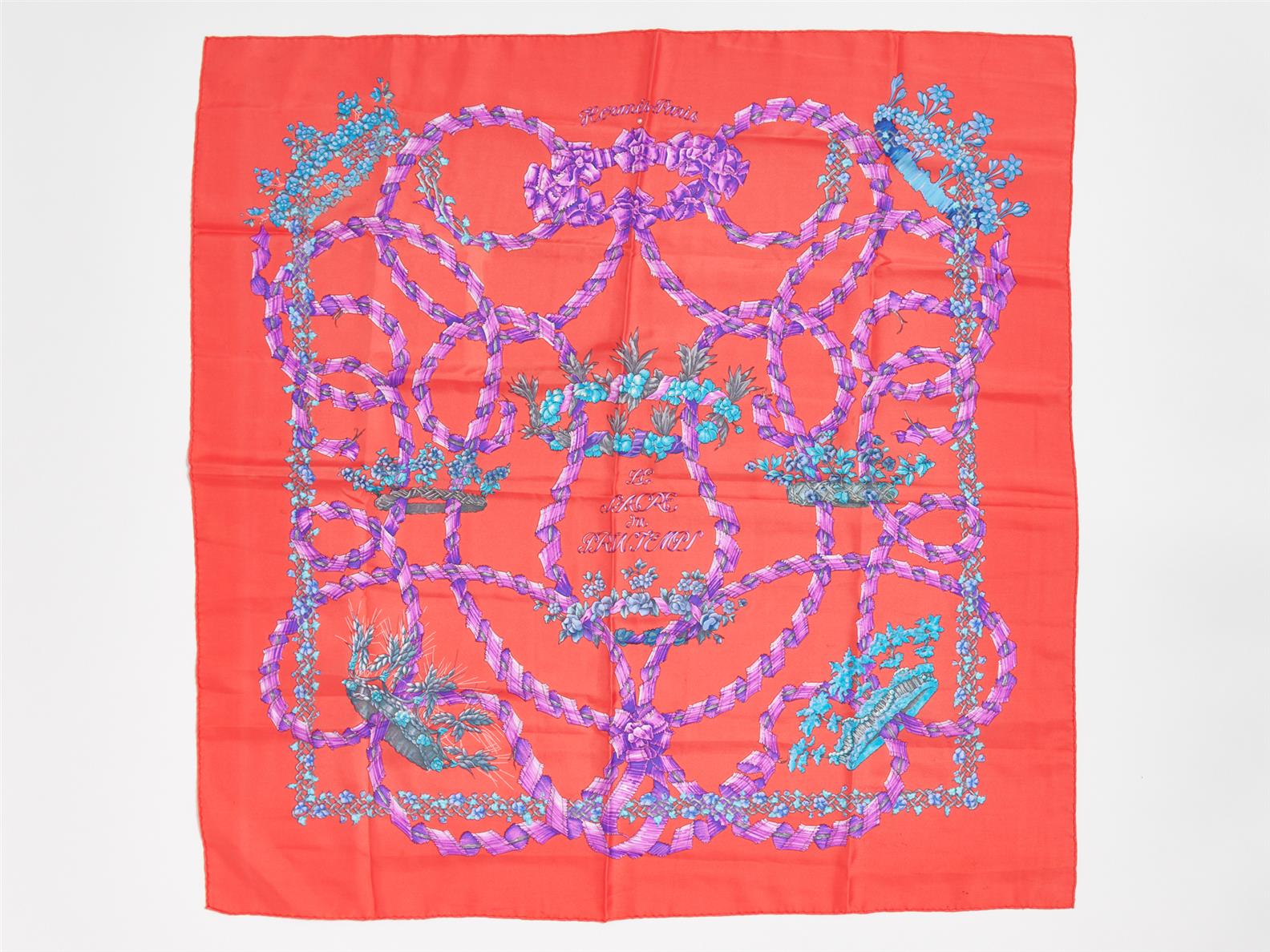 HERMES, SILK CARRÉ - The Le Sacre du Printemps design by by Henri d'Origny styled in purple, blue and coral, 90cm squared.