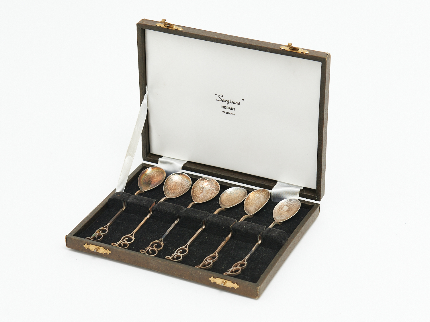 A SET OF SIX AUSTRALIAN SILVER TEASPOONS BY SARGISONS HOBART, CASED, LEONARD JOEL LOCAL DELIVERY: SMALL